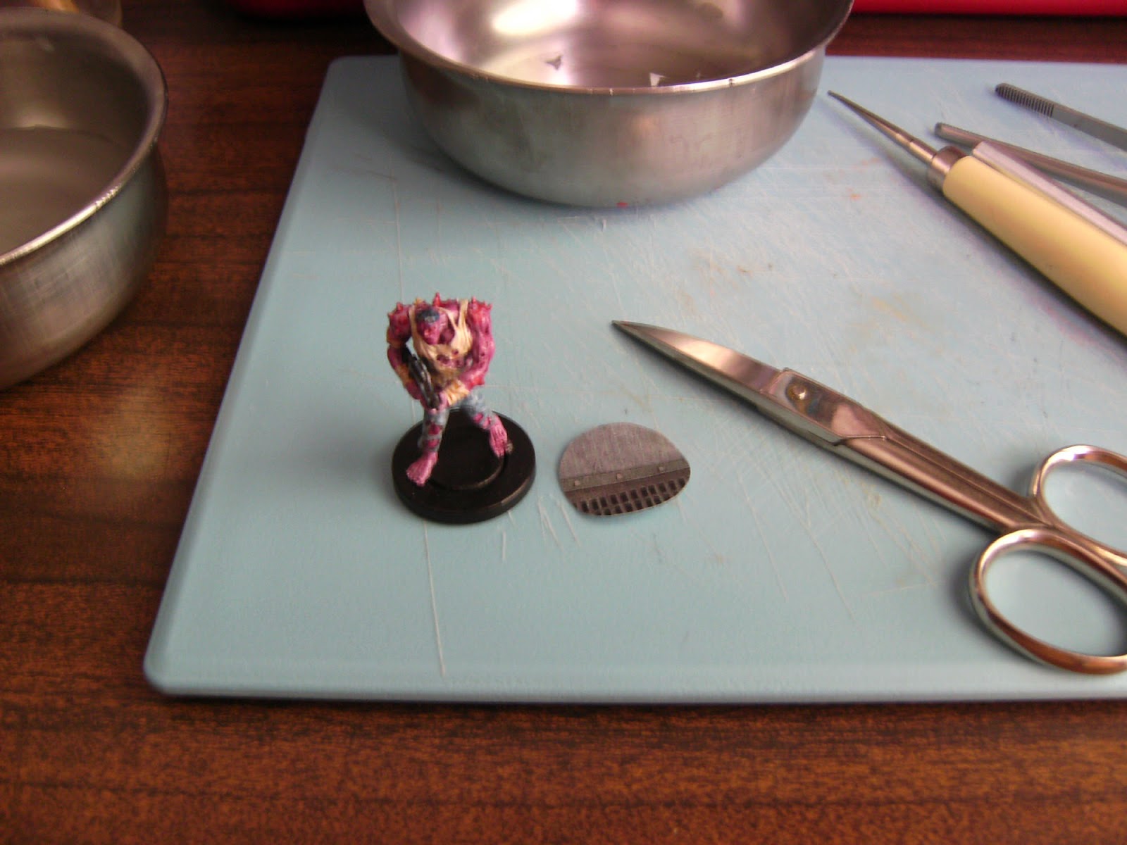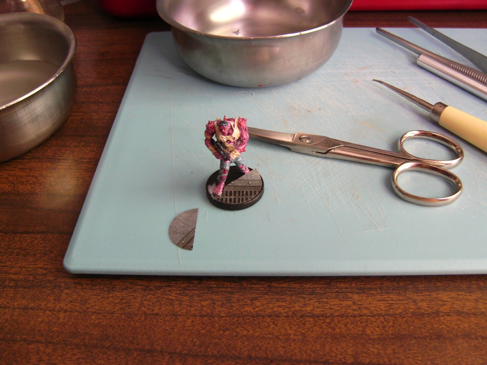 En miniaturas con peana más grande primero recubre bien alrededor de los pies, y luego aplica una sola pieza con los mínimos cortes posibles.