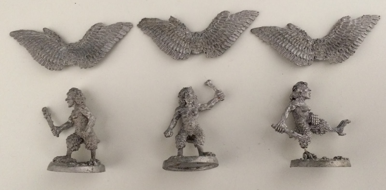 Seguimos Catalogando elfos oscuros. En el caso de los druchii, voy a hacer un experimento (al terminar los elfos oscuros me decís que tal). Ya hemos visto cosas puramente de 3ª. Sin embargo, a partir de ahora voy a mezclar ligeramente algunas cosas de 3ª en los posts de miniaturas «temáticas». Por ejemplo, hoy vamos a ver las Arpías (si bien han ido unidas «al Caos» muchas veces, forman parte de los druchiis para nosotros) y voy a incluir las de 3ª. De hecho es curioso ver la evolución: en 3ª edición eran arpías «humanas», en 4ª pasaron a ser arpías «bestias» y en 6ª fueron arpías «elfas».