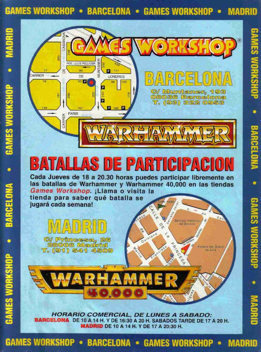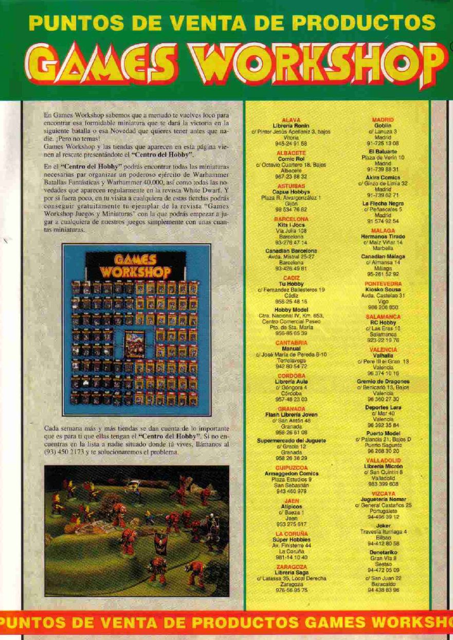 Dentro de la revista encontrábamos dos páginas para saber dónde comprar sus productos. Primero (lógicamente) anunciando las dos tiendas Games Workshop, que por aquél entonces eran únicamente Muntaner (Barcelona) y Princesa (Madrid).esta última inaugurada hacía poco. También había un listado exhaustivo de todas las tiendas independientes que vendían productos Games Workshop (algo que estaría hasta bien entrados el siglo XXI), en la que seguro que veis alguna tienda que conocíais (¡o que ibais!).