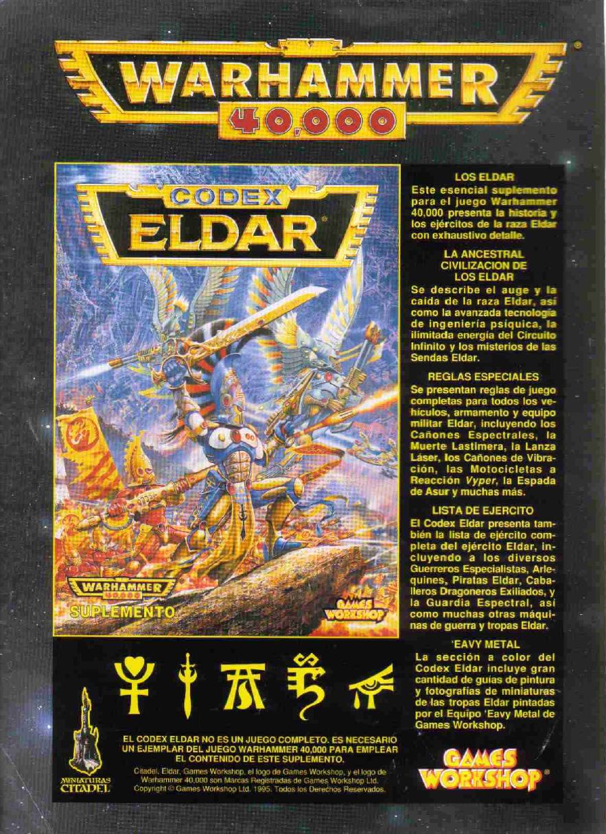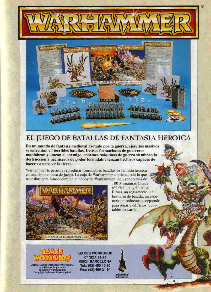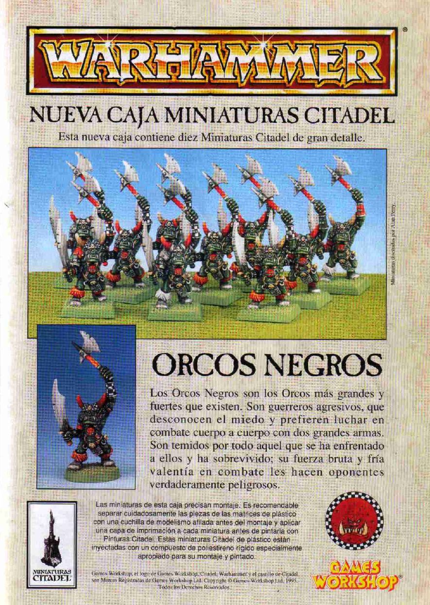 En cuanto a la publicidad, veíamos publi del Códex Eldar (novedad del mes), el Land Speeder (no era novedad), la caja de Warhammer de Cuarta, el libro del Imperio (novedad ese mes) y una con la nueva caja con ocho Orcos Negros de plástico (que había salido en la caja City of Adventure de Talisman el año anterior y ahora aprovechaban para Warhammer).