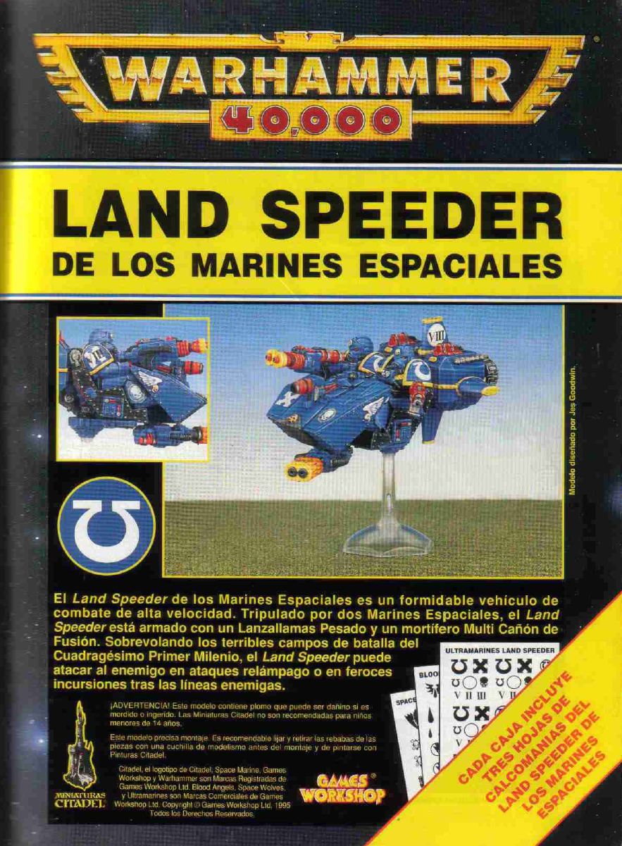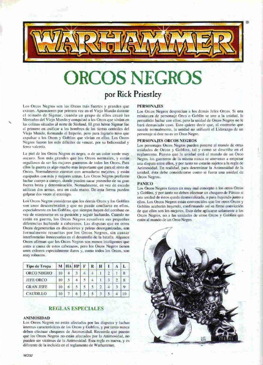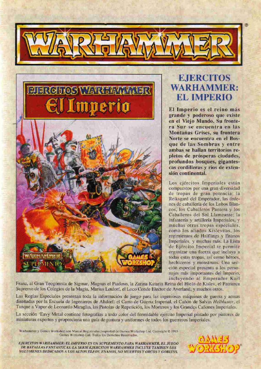 En cuanto a la publicidad, veíamos publi del Códex Eldar (novedad del mes), el Land Speeder (no era novedad), la caja de Warhammer de Cuarta, el libro del Imperio (novedad ese mes) y una con la nueva caja con ocho Orcos Negros de plástico (que había salido en la caja City of Adventure de Talisman el año anterior y ahora aprovechaban para Warhammer).