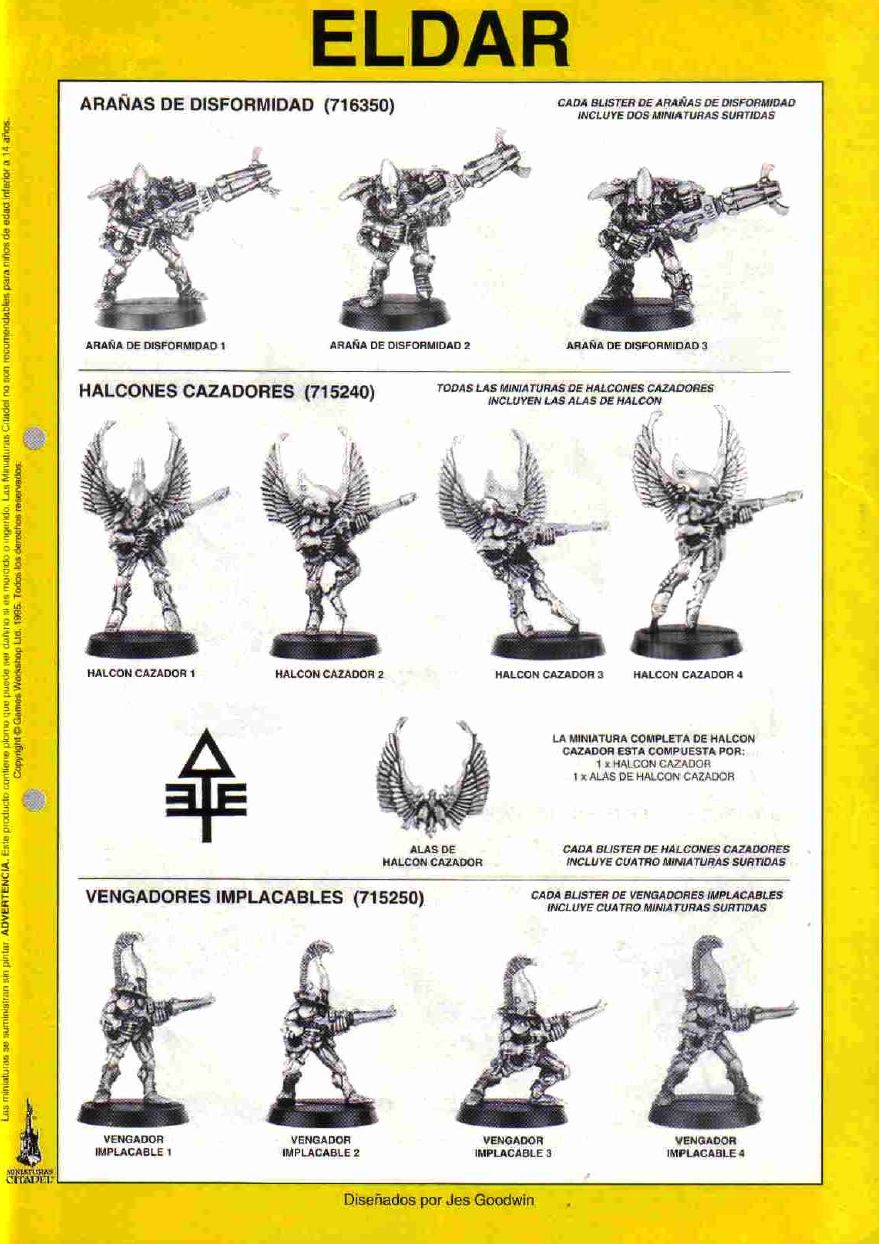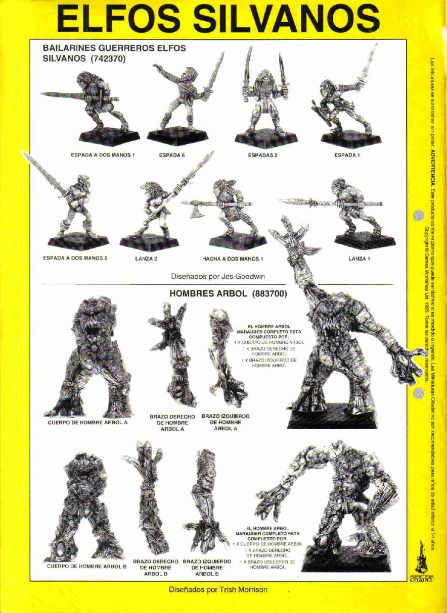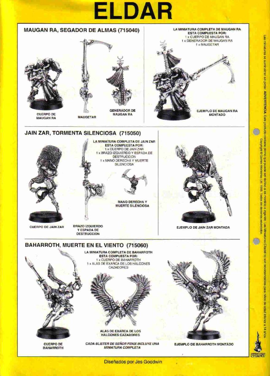 Y una de mis secciones favoritas, el catálogo. Vemos despiece de Guardia Imperial, de Eldars (novedades), y de la parte de fantasía el Héroe en pegaso imperial, bailarines viejuners (del ’87) y los dos hombres árbol para Elfos Silvanos, los héroes imperiales que habían salido el número anterior, y las diablillas en corcel.