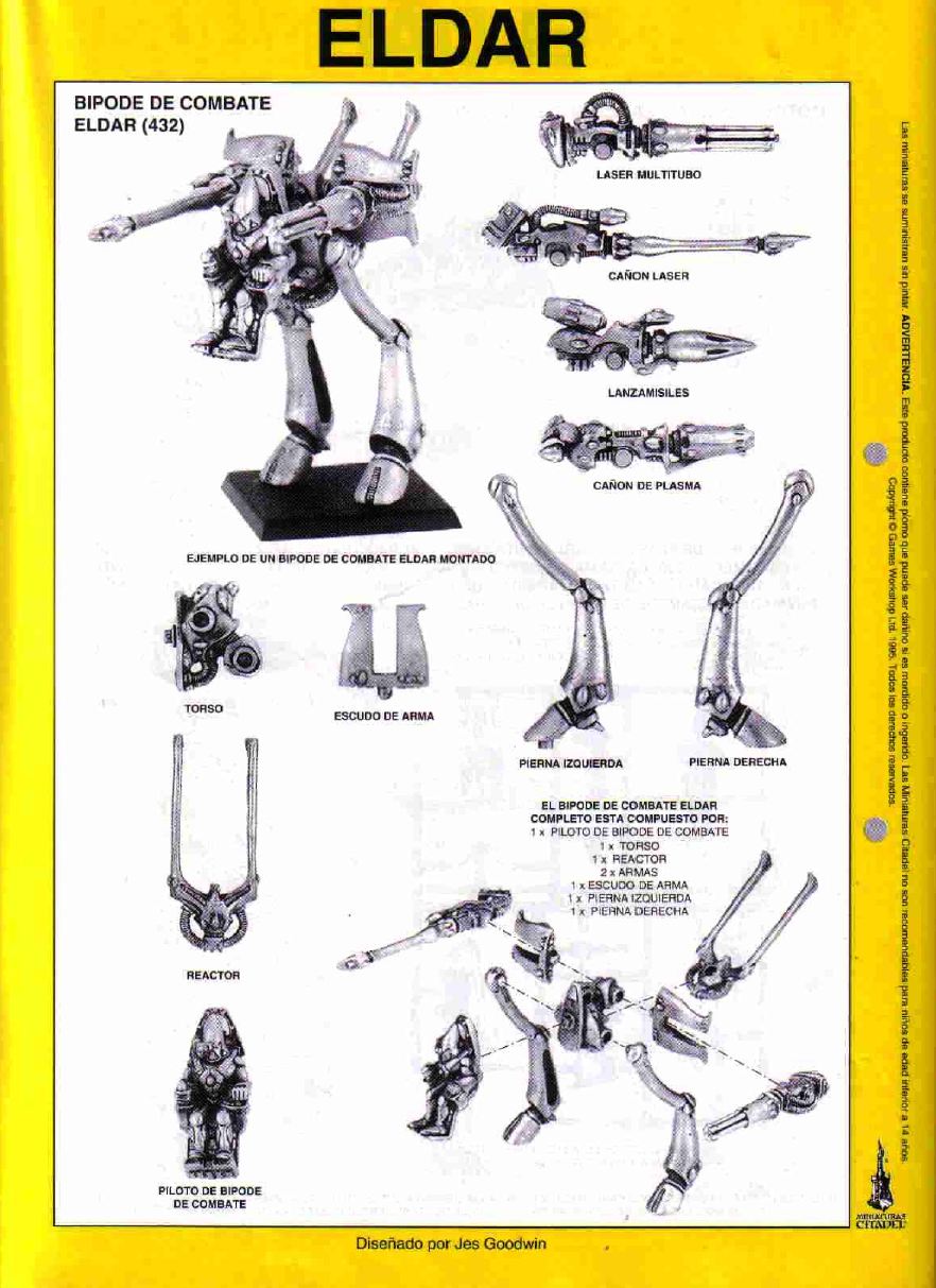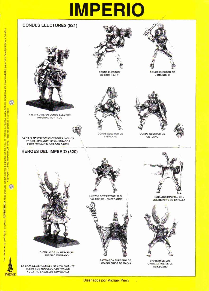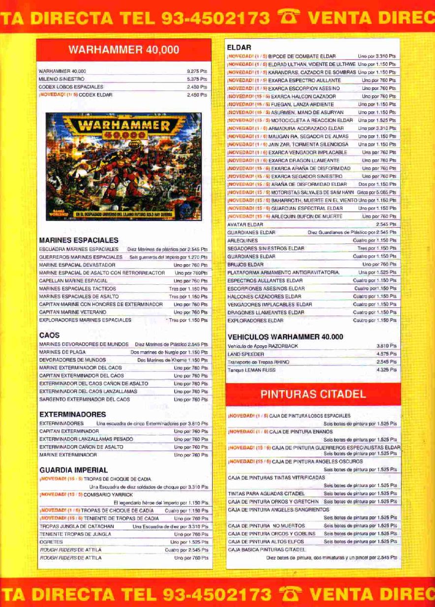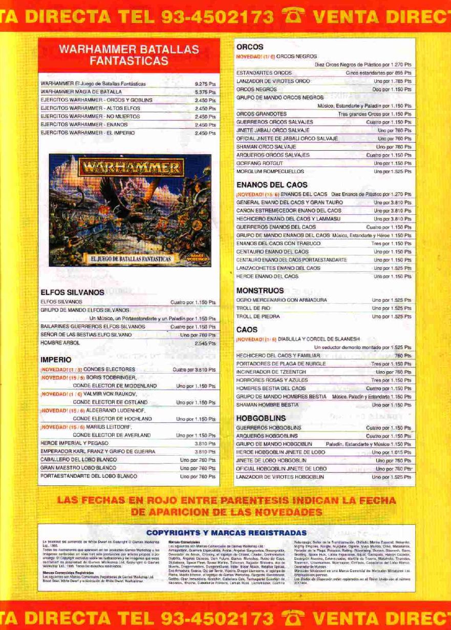 Y una de mis secciones favoritas, el catálogo. Vemos despiece de Guardia Imperial, de Eldars (novedades), y de la parte de fantasía el Héroe en pegaso imperial, bailarines viejuners (del ’87) y los dos hombres árbol para Elfos Silvanos, los héroes imperiales que habían salido el número anterior, y las diablillas en corcel.