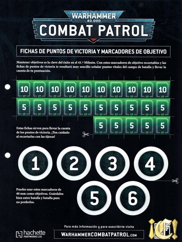- Juego (10+1). Hay una hoja donde da el resumen de las cinco fases (mando, movimiento, disparo, carga y combate), otra hoja con los objetivos y su control, y una misión de control de tres objetivos (nada mal). Y he puesto +1 porque hay recortable de los puntos de victoria y los marcadores, que la podéis ver aquí: