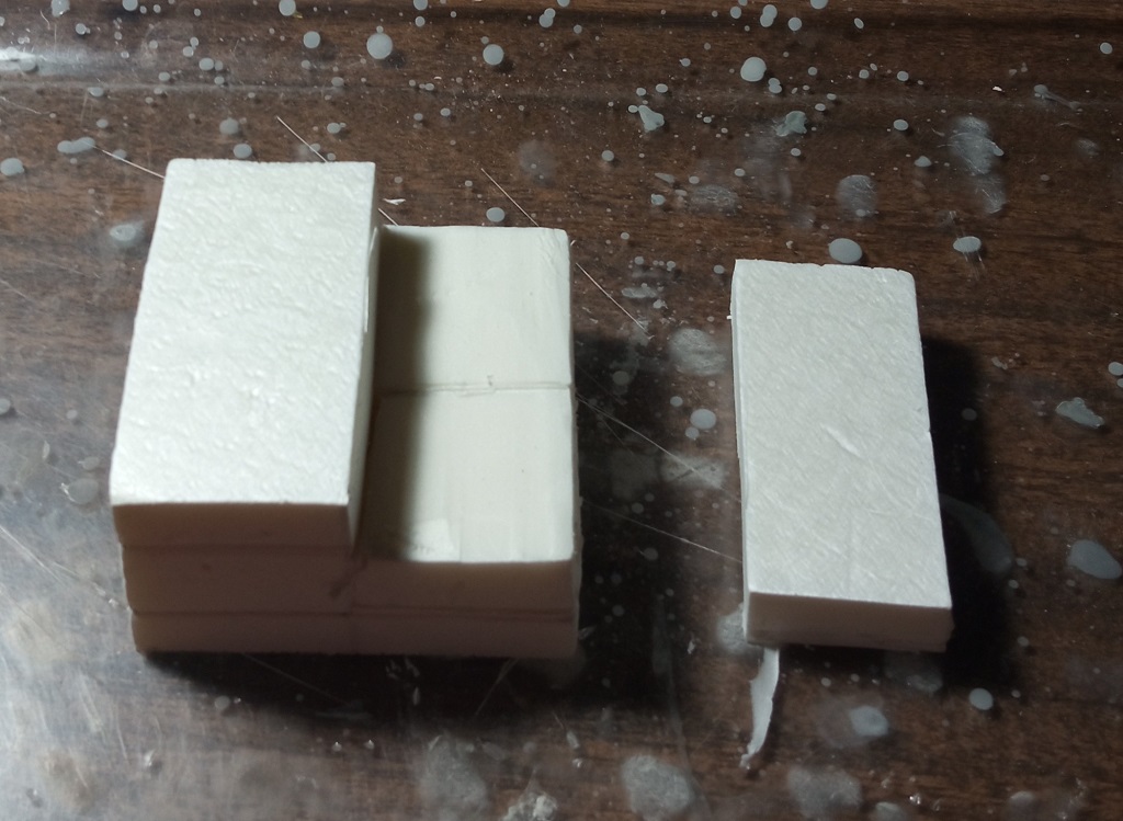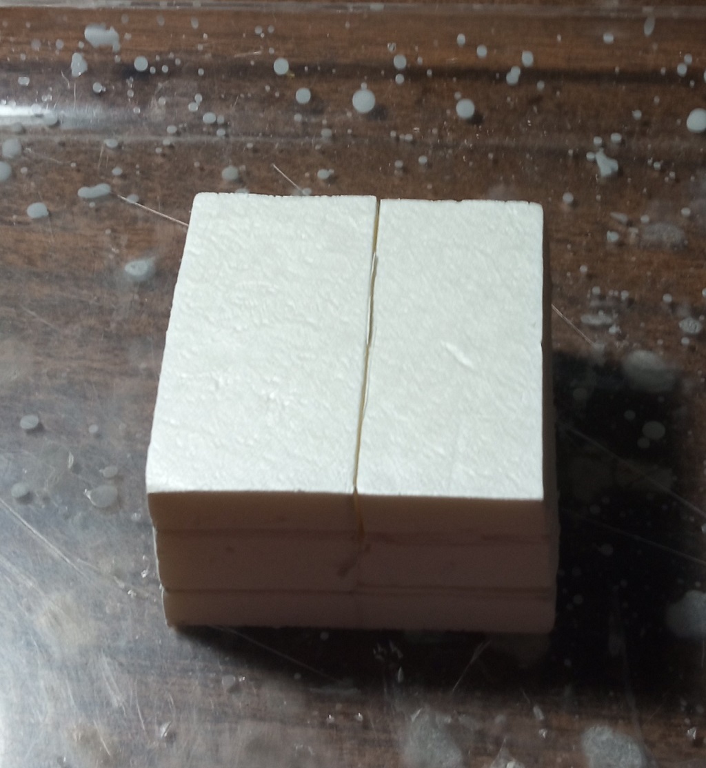 Necesitas un bloque de poliestireno extruido. Puedes usar la densidad que quieras, incluso poliestireno expandido (el de bolitas) aunque este último es más difícil de trabajar y deja peor resultado. Por ello mi recomendado es poliestireno extruido, el más compacto. Lo corto con cuchilla, eso del cortador de poliestireno de mesa ya es un tema serio y para lo poco que hago es mucho espacio – mucho dinero.