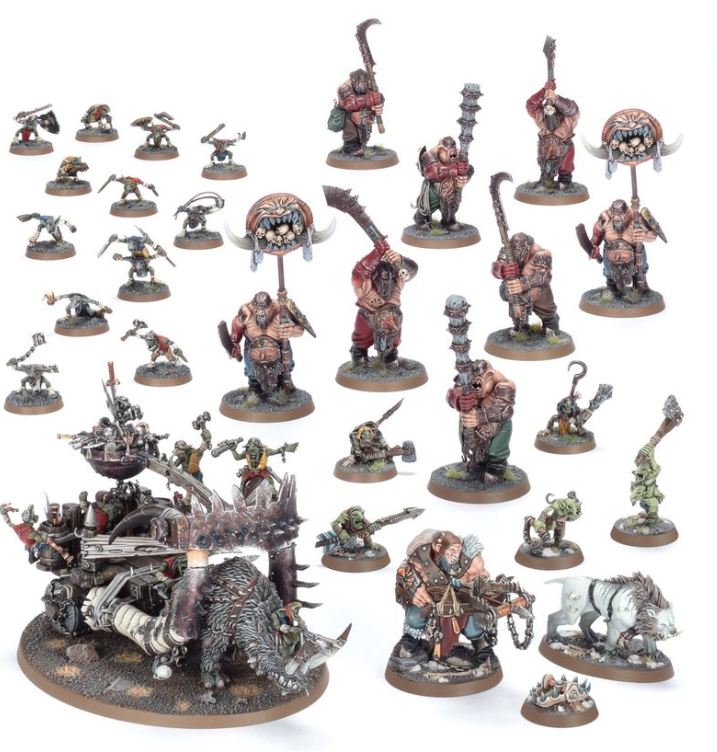 La nueva caja de Ogros (115€) abre también con una banda de Underworlds, los Tramperos de Hrothgorn (35€), ya descatalogada, que contiene un cazador ogro, un Colmillos de Sable, una trampa y tres tramperos gnoblars. Incluye también un Tirasobras (34€) que puede montarse como el temido Escupehierros. En caso de montarlo como Tirasobras tienes un ogro más a pie con algo de maña; si lo montas como carrocañón tienes unos cuantos gnoblars más. En la caja han metido también media caja de Gnoblars (17€). Pero no os preocupéis, que entre pitos y flautas vas a poder montar una unidad de Gnoblars entera. Porque también se incluyen dos cajas de Tripasduras (70€), que vienen con más gnoblars. Personalmente me parece una buena caja y que combina bien con la anterior (que ya no está a la venta oficialmente), y ofrece un ahorro respecto PVP del 26%. Descuento no tan bonito como el de los Seraphon, pero que no está mal (y es también muy aprovechable para los viejomundanos).