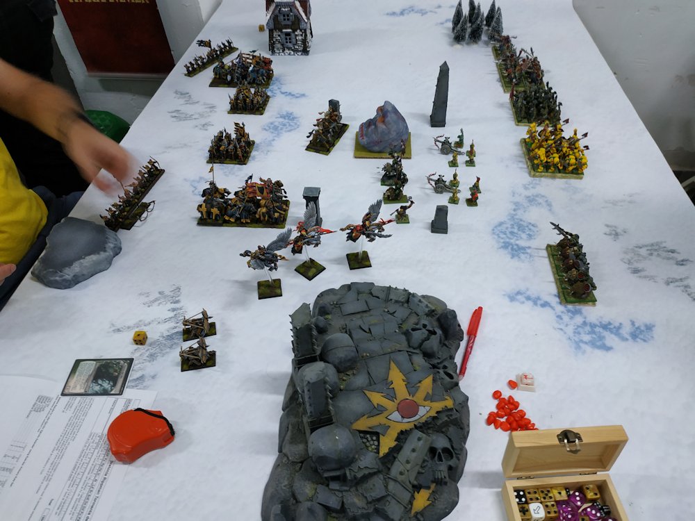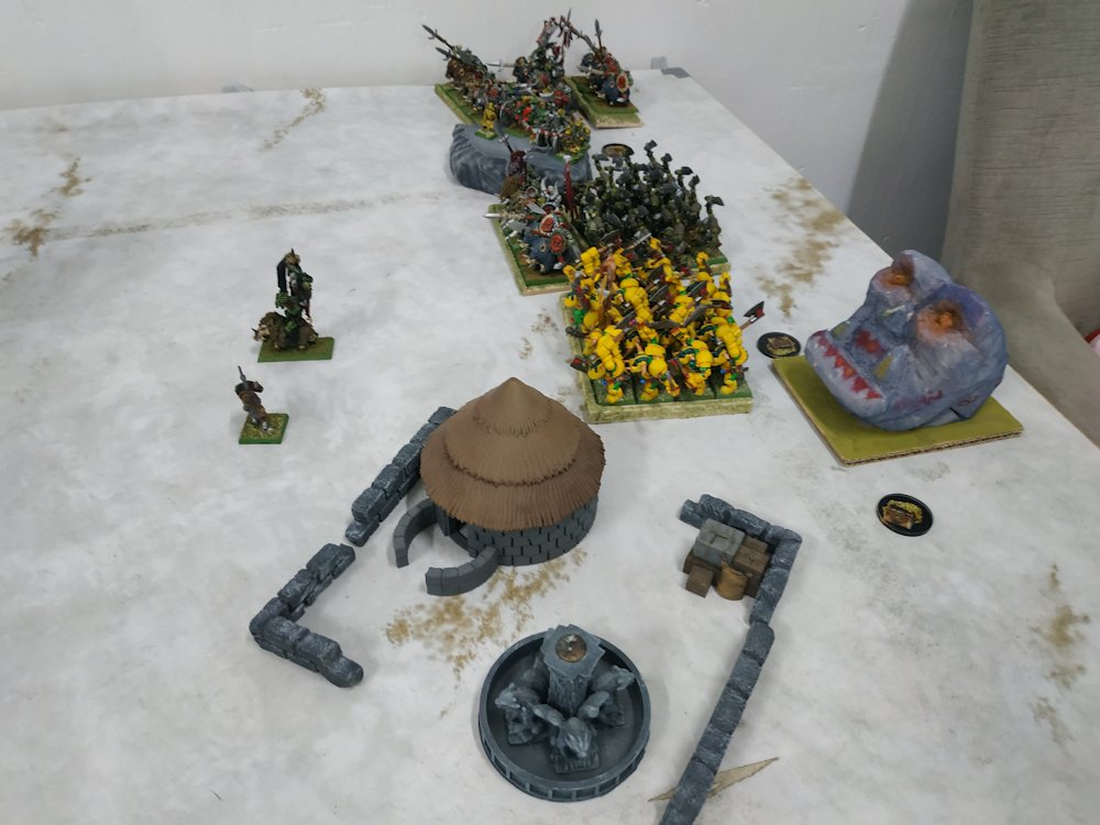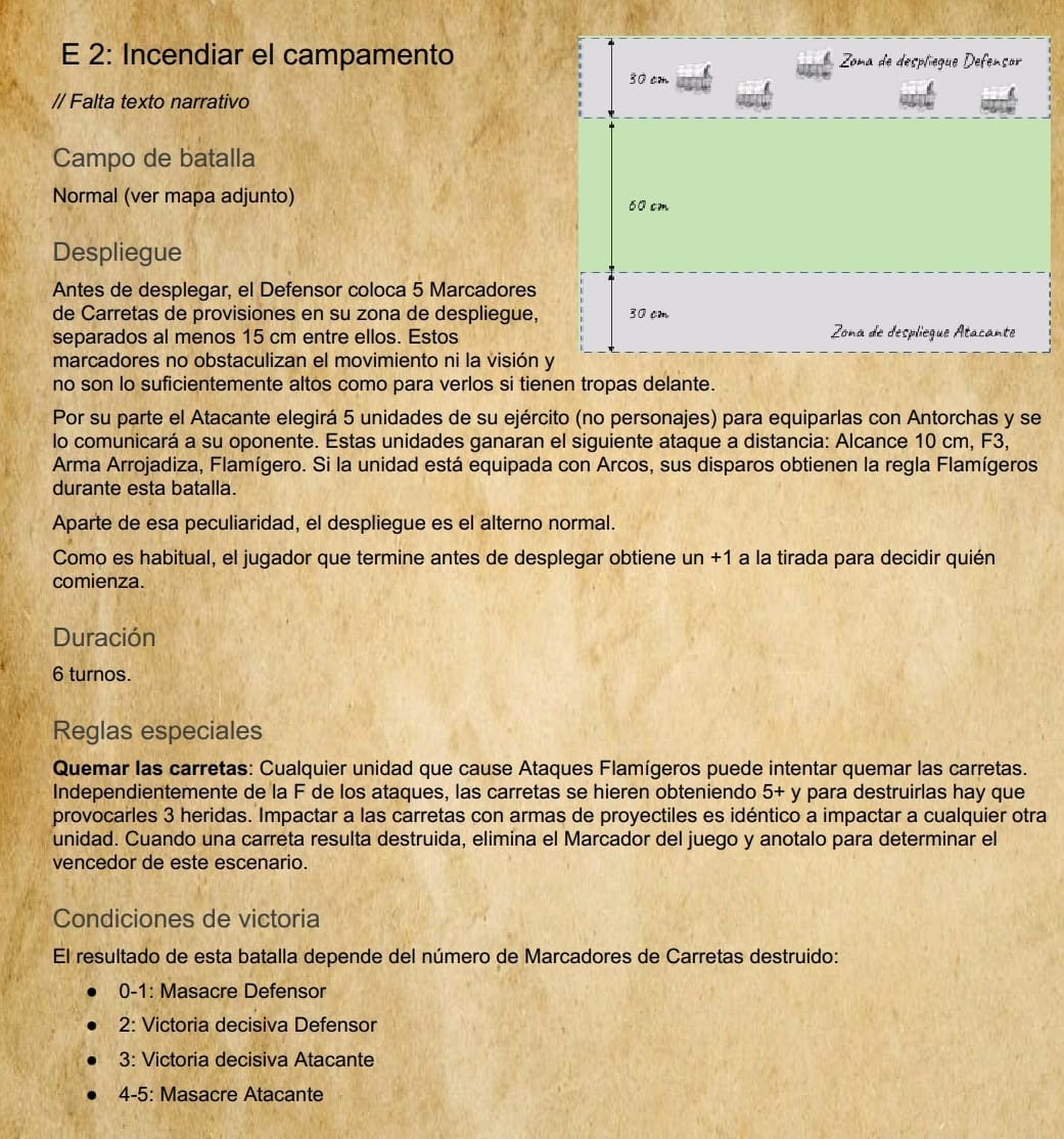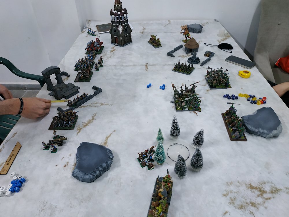 El escenario era un contraataque contra los campamentos de las fuerzas de la oscuridad. El objetivo de la batalla era destruir los carromatos de provisiones/prisioneros o altares oscuros enemigos. 5 marcadores a colocar. Cada marcador tenía 3 heridas, se le hería a +5 con ataques flamígeros. Había que ir acabando con ellos. El otro bando contaba con equipar hasta a 5 unidades con antorchas (rango 10 cm y fuerza 3). Si contabas con tropas con arcos, mantenías tu rango de alcance. No había reglas para incendiar vitotes de máquinas de guerra, pero consideramos que se podía dotar de “antorchas/fuego” a una de ellas (sobre la marcha vimos esta regla)
