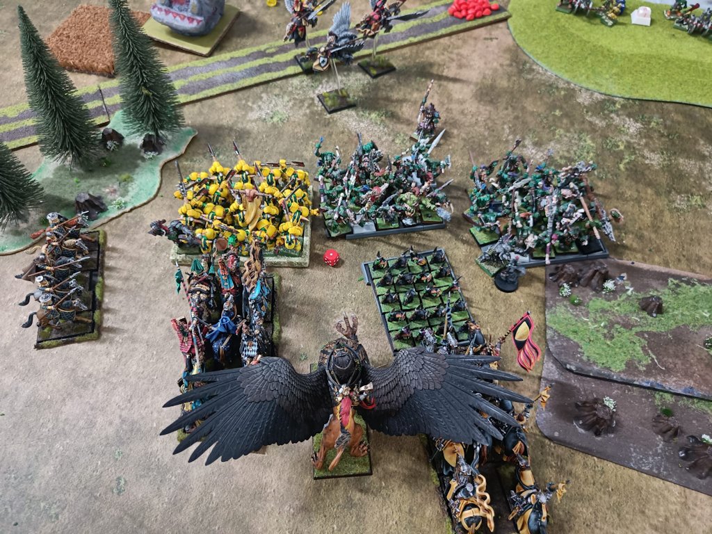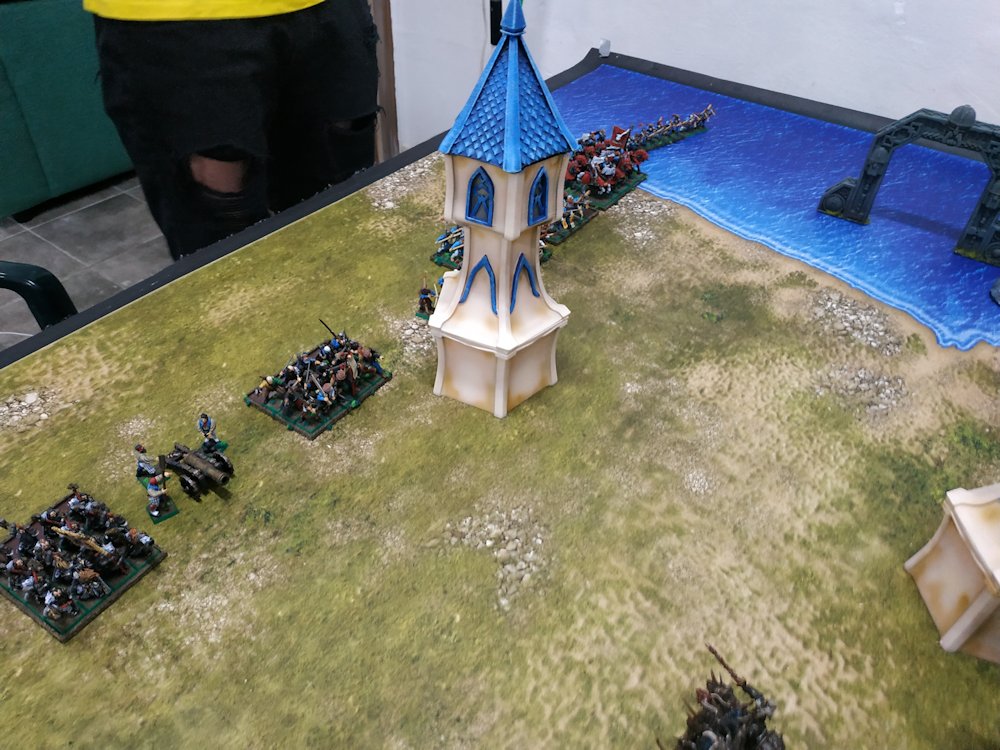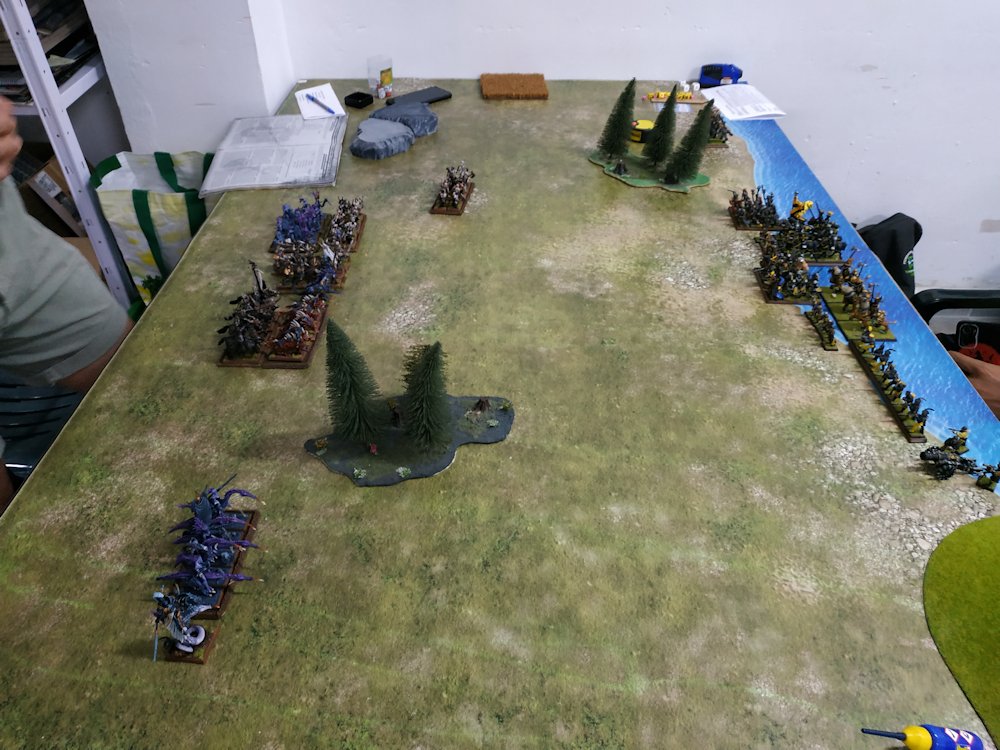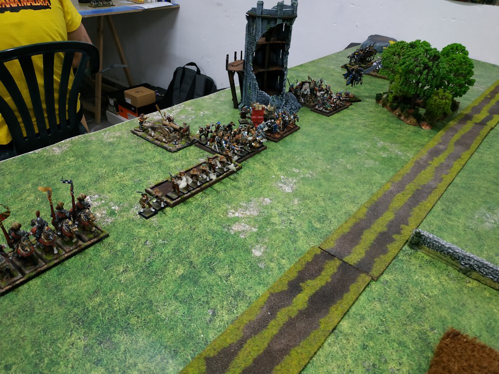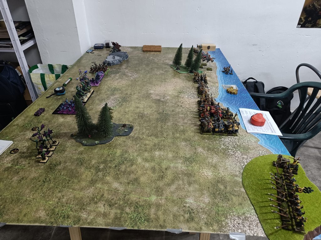 El escenario era un contraataque contra los campamentos de las fuerzas de la oscuridad. El objetivo de la batalla era destruir los carromatos de provisiones/prisioneros o altares oscuros enemigos. 5 marcadores a colocar. Cada marcador tenía 3 heridas, se le hería a +5 con ataques flamígeros. Había que ir acabando con ellos. El otro bando contaba con equipar hasta a 5 unidades con antorchas (rango 10 cm y fuerza 3). Si contabas con tropas con arcos, mantenías tu rango de alcance. No había reglas para incendiar vitotes de máquinas de guerra, pero consideramos que se podía dotar de “antorchas/fuego” a una de ellas (sobre la marcha vimos esta regla)