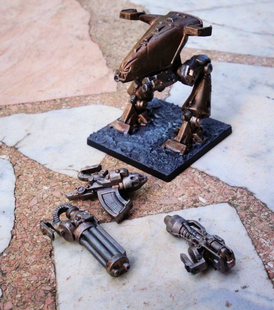 Y por fin la última miniatura del Cruzada Estelar, el Dreadnought. He tardado porque no tenía claro qué esquema de colores usar. Al final he optado por hacerlo coherente con los Necrones (aunque sea del Caos, va «con los Androides del Caos»). El problema es que aquí no había nada verde fluorescente, tenía que ser todo metálico y no quería que fuera totalmente uniforme. Así que (aunque creo que en la foto no se aprecia mucho) hay piezas de Runelord Brass, hay piezas de Leadbelcher, y luego hay distintas tintas según la zona. Esto hace que todo «sea parecido» pero no sea igual.