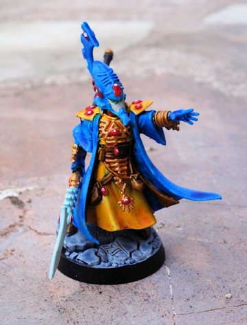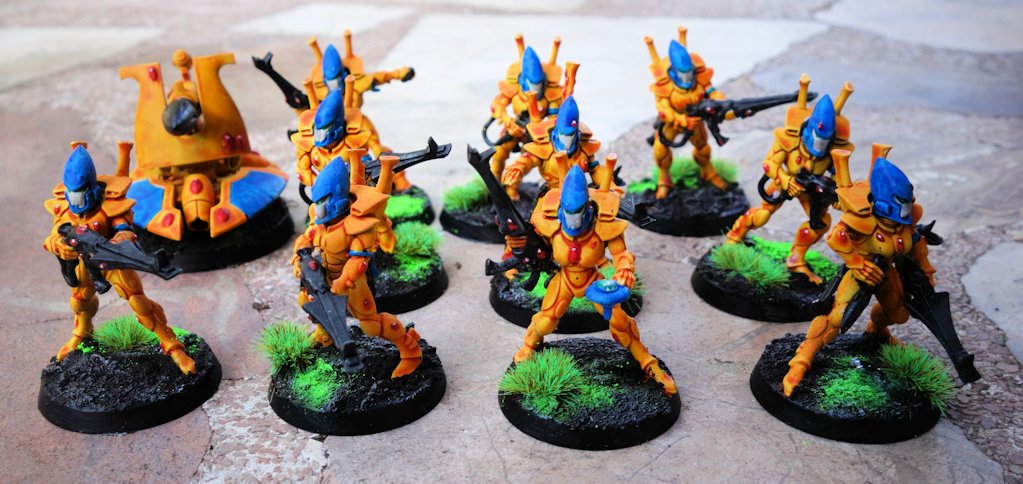 Sí, he empezado los Eldars. No tenía ni idea de qué Mundo Astronave pintarlos. Sinceramente, lo he hecho por descarte de colores, ya tengo algo azul (ultramarines), verde (salamandras, orcos), blanco (taus), metálico (necrones), rojo (adeptus mechanicus), negro (hermanas)… y no quería repetir color con ningún ejército. Y entonces vi que no tenía ningún ejército amarillo, ni de Fantasy ni de 40k. Además, la Contrast que tengo se llama Iyanden, por lo que la elección parecía obvia. Partiendo de imprimación blanca, he usado Contrast Iyanden Yellow y Talassar Blue. Las armas son de Black Templar, y con las gemas me he estado un poco más de tiempo, haciéndolas rojas (no quería repetir el azul). Hay algunos detalles más en dorado, en verde (los HOJOS™), en Aethermatic Blue (lanza del señor Vicente) y poco más. Tierra volcánica, pigmento verde lima GSW, y he estrenado los tufts Fluor Grinch Green (también de Green Stuff World). Bastante contento de cómo me han quedado.