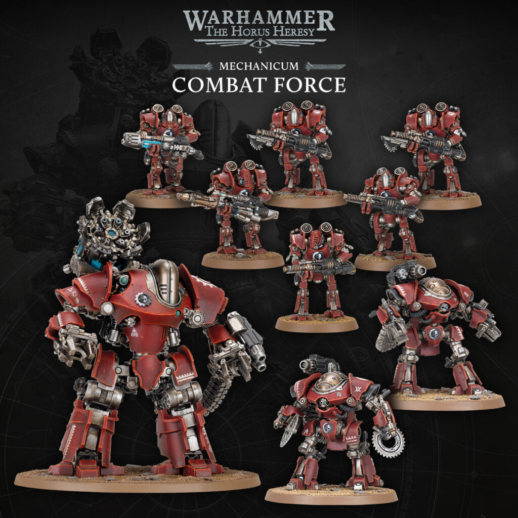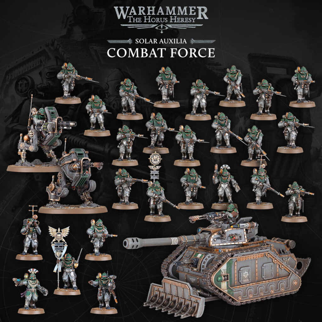 Tanto para Solar Auxilia, Mechanicus y marines (porque esto es Herejía de Horus) , tenemos cajas de inicio mas pequeñas . Parecidas en numero de miniaturas a una Patrulla de Combate, suponen un punto de entrada “bueno”. Lo pongo entre comillas porque no tienen un modo propio de juego a lo Punta de Lanza (de momento), y para empezar a jugar, es algo pequeño . Como expansiones están bien pero como caja para iniciarse es algo escasa.
