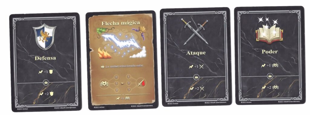 Los niveles pares veis que debajo tienen una corona marcada. Eso quiere decir que una vez por turno puedes usar la versión potenciada de la carta. Si recordáis del post de combate (y si no aquí tenéis la foto de nuevo) muchas cartas tienen un efecto, y debajo sale una corona y el efecto «potenciado». Por ejemplo la carta de Defensa te da +1 a la Defensa, pero la versión potenciada +2. Si tu héroe es de nivel 2 puedes lanzar una carta potenciada durante el combate; si es de nivel 4 dos cartas potenciadas, y si es de nivel 6 tres cartas potenciadas.