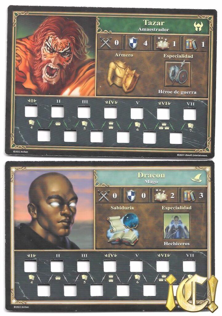 Al empezar la partida, cada jugador debe elegir uno de los héroes que tiene disponibles. Son tarjetas de dos caras y para cada facción viene una tarjeta (con lo que tienes dos héroes por facción). Sin embargo, en la caja (exclusiva del crowdfunding) de la Torre, venía una tarjeta adicional por facción, con lo que con esta caja tienes cuatro héroes entre los que elegir. En la imagen podéis ver un ejemplo de dos héroes: Tazar de Fortaleza (lagartos) y Dracon de la Torre (magos).