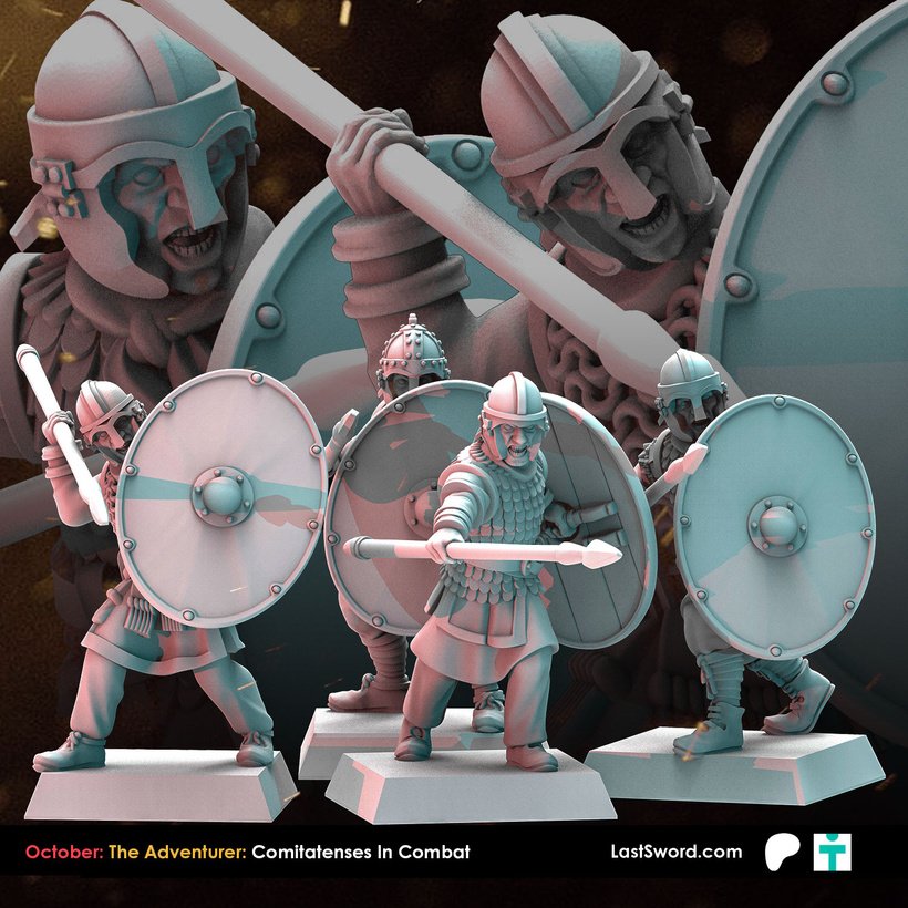 Entre los siglos III y IV, las reformas de Diocleciano y Constantino reordenan las fuerzas imperiales. Surgen los comitatenses, reservas móviles capaces de desplazarse rápidamente y actuar donde el Imperio lo exige: Rin, Danubio o crisis internas. Su imagen combina cascos segmentados o de cresta, cota de malla y escamas, escudo oval o circular con umbo, spatha al costado, lanza, y dardos plumbatae como elemento característico de la infantería tardía.