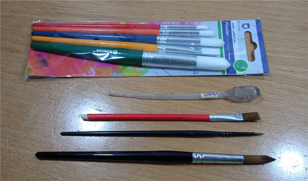 En el paquete, cinco pinceles de bazar para no mezclar los que usé el otro día con «white spirit» con los que voy a usar hoy con «símil aguarrás».