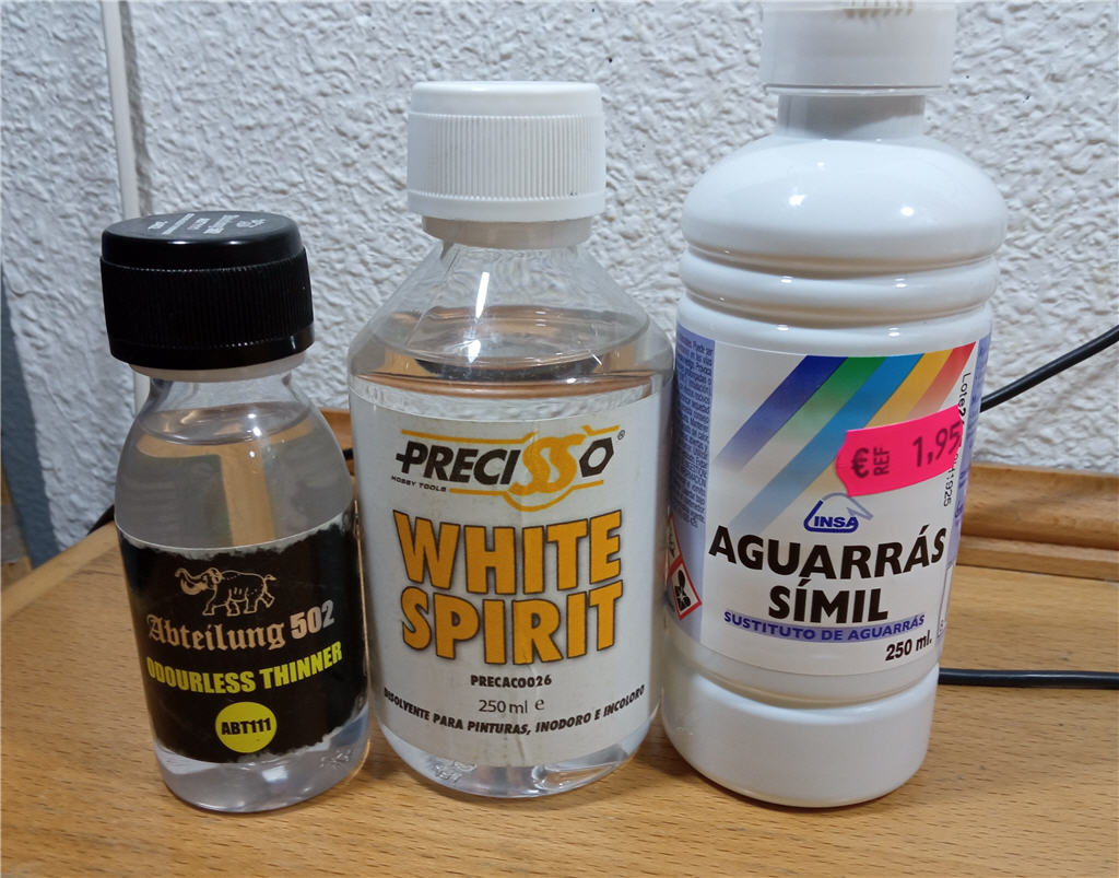 Mi segunda opción es el «white spirit» de AK, sea la gama «abteilung» o la genérica que tiene. El bote de 100 ml a unos 6 leuros y pico. Funciona.