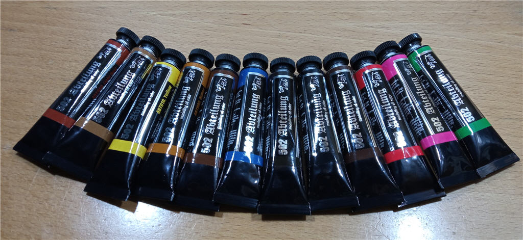 En tema óleos, elegí la marca de AK porque ya había estado rebuscando sobre el tema y lo recomiendan porque tiene muy poco aceite. De esta forma no hay que ponerlos sobre cartón un rato para retirar parte del aceite. Si tienen aceite, tardan más en secar. Marcas de bellas artes como titan o windsor son muy majos, pero por lo que he estado leyendo son más complejos de usar por esto.