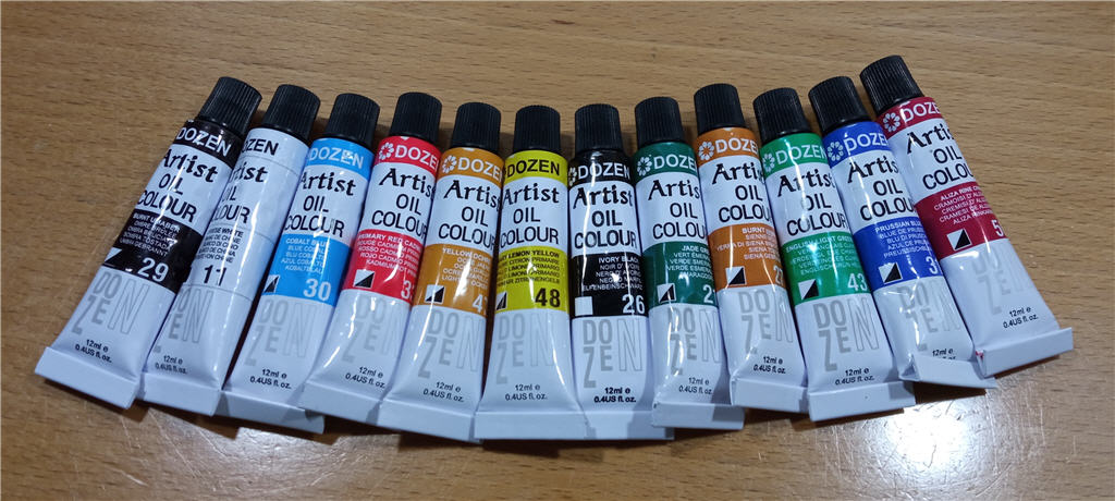 No compres óleos demasiado baratos. Esta docena me costó cinco euros. Los compré en el bazar para probarlos, son muy malos, cuesta mucho disolverlos. Dejo la foto para que sea testigo de lo mala compra que hice.