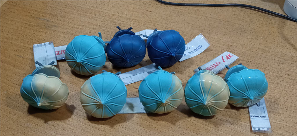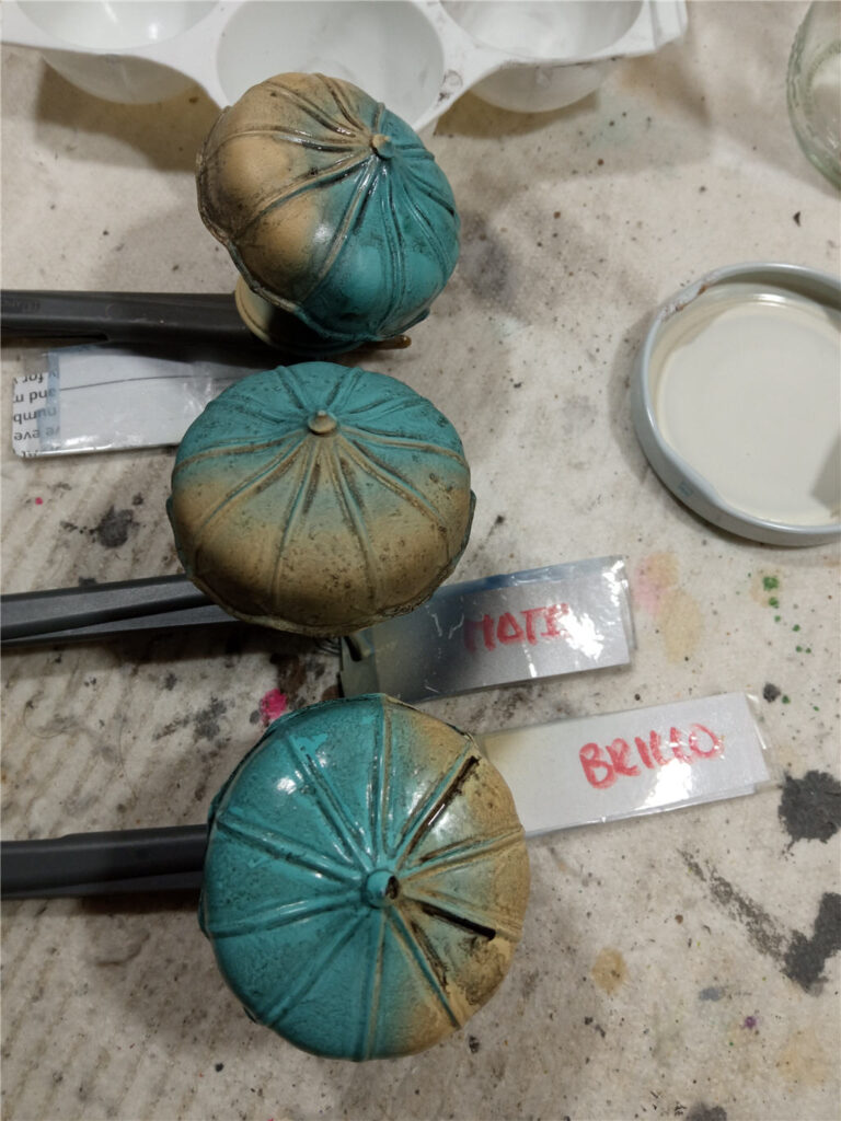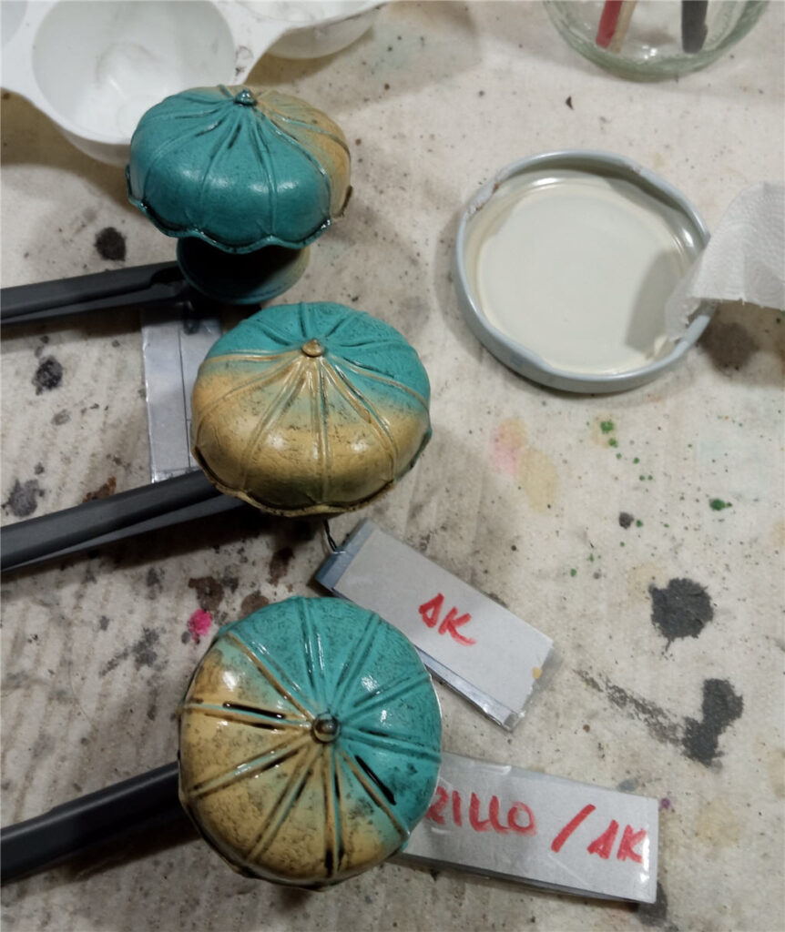 Dos de las piezas están barnizadas en mate, y otras dos están barnizadas en brillante. Lo del barniz es un poco por probar si protege la pintura, otro poco porque he leído que el barniz brillante favorece que el lavado corra mejor a los recovecos.
