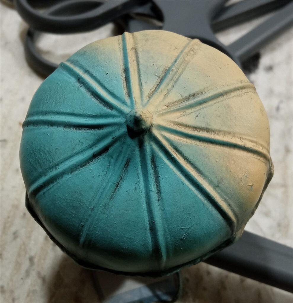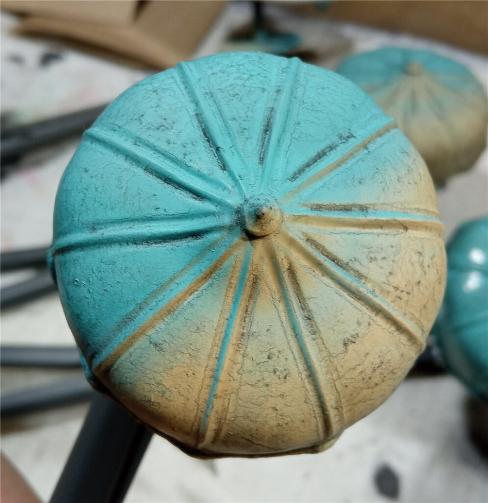 Imprimación en negro vallejo premiun con aerógrafo, seguido de una capa de blanco de la misma marca. En color, la mitad de la sombrilla va en color carne vallejo premiun y la otra mitad en azul cianite de ak.