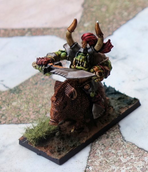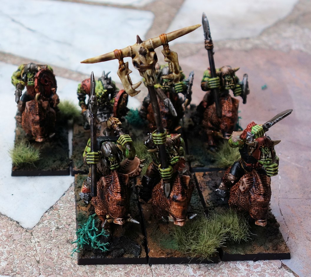 Pues ocho pielesverdes más que engrosan mis filas. Los siete Jinetez son de plástico (conversionados a partir del «héroe orco»), el kaudillo es el infame Grotfang Garra’ierro que salió para la campaña Ídolo de Morko hace casi 30 años. Miniatura que (creo) ha envejecido bastante bien, aunque perdí tanto el jabalí original como el estandarte de la espalda, así que queda un poco «perdido». ¿Y el escudo? Pues tocará pintarlo aparte, pero lo doy por finalizado ahora mismo 😛