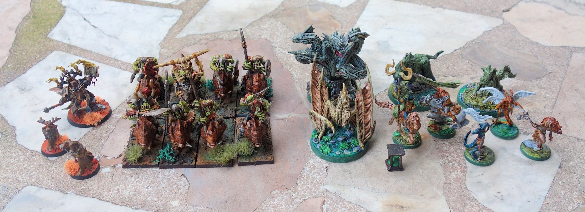 - Hidra. Y llegamos a la joya de la corona. Sabía qué quería. Las hidras del HoMM3 eran de un color entre gris y verde, y quería ese tono. La prueba me salió a la primera y estoy ENCANTADO de cómo me ha quedado (mis hidras druchii las pintaré igual… cuando pinte elfos oscuros). Usé Contrast Space Wolves Grey (que habitualmente sólo uso para piedra), y encima la Shade Athonian Camoshade. El resultado, me encanta, es exactamente lo que buscaba. ¿Será casualidad? Bueno, casualidad habría sido pillar botes al azar, digo yo… pero algo de «a ver qué tal» sí que ha sido.