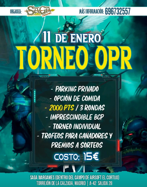 Si sois de Madrid o estaís cerca, en Saga Wargames están organizando un torneo muy chulo. Un par de partidas con buen ambiente, con aparcamiento garantizado (que a dia de hoy, se agradece) y si vas con hambre, te vuelves saciado. Por si las dudas, BCP es Best Coast Pairings, una aplicacion para realizar torneos y emparejamientos de manera mas eficiente.