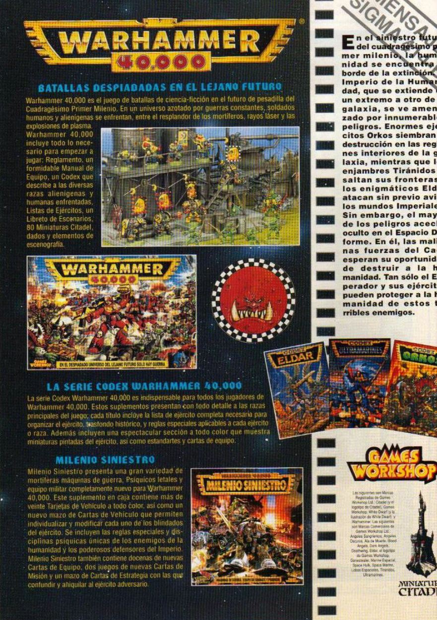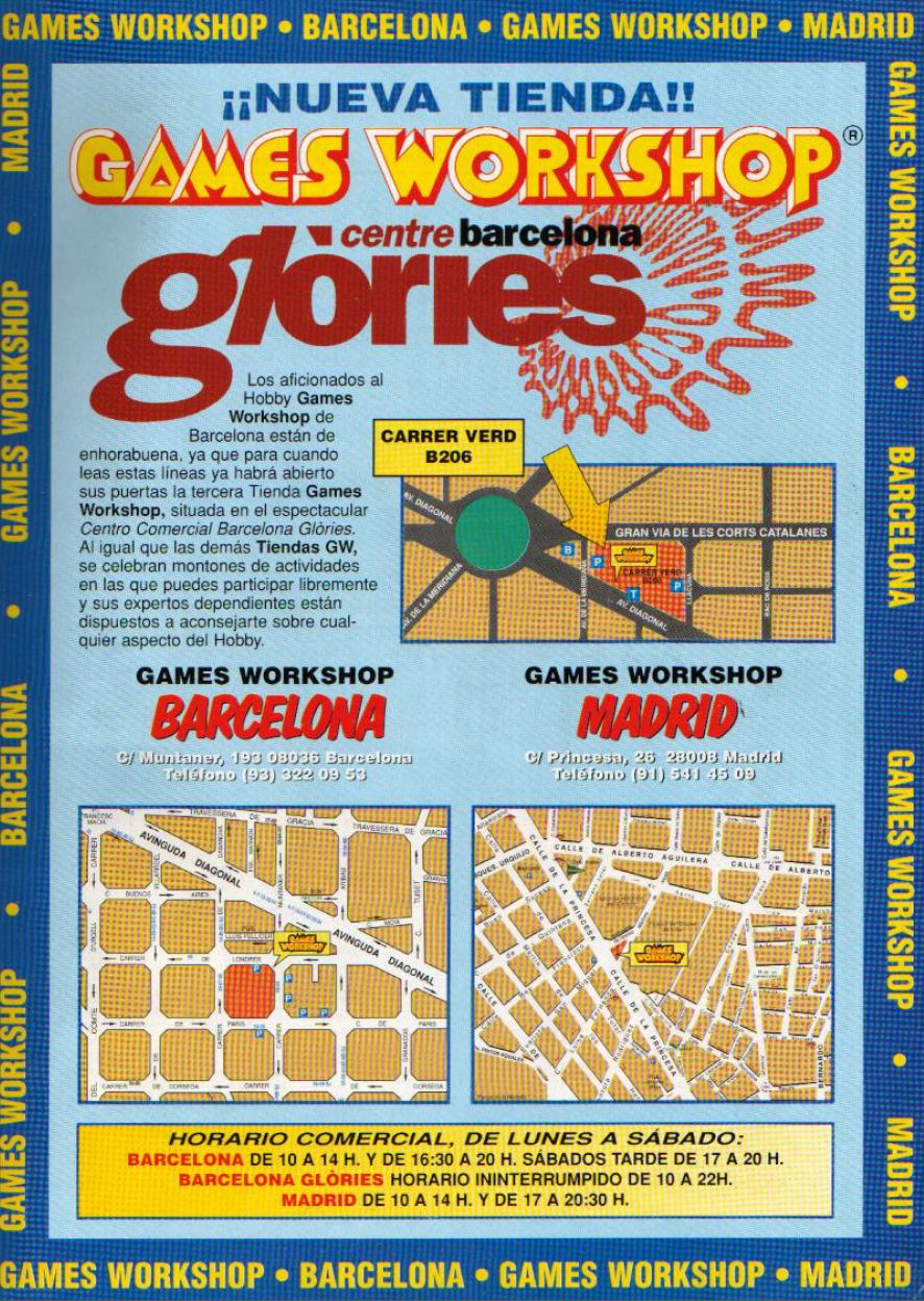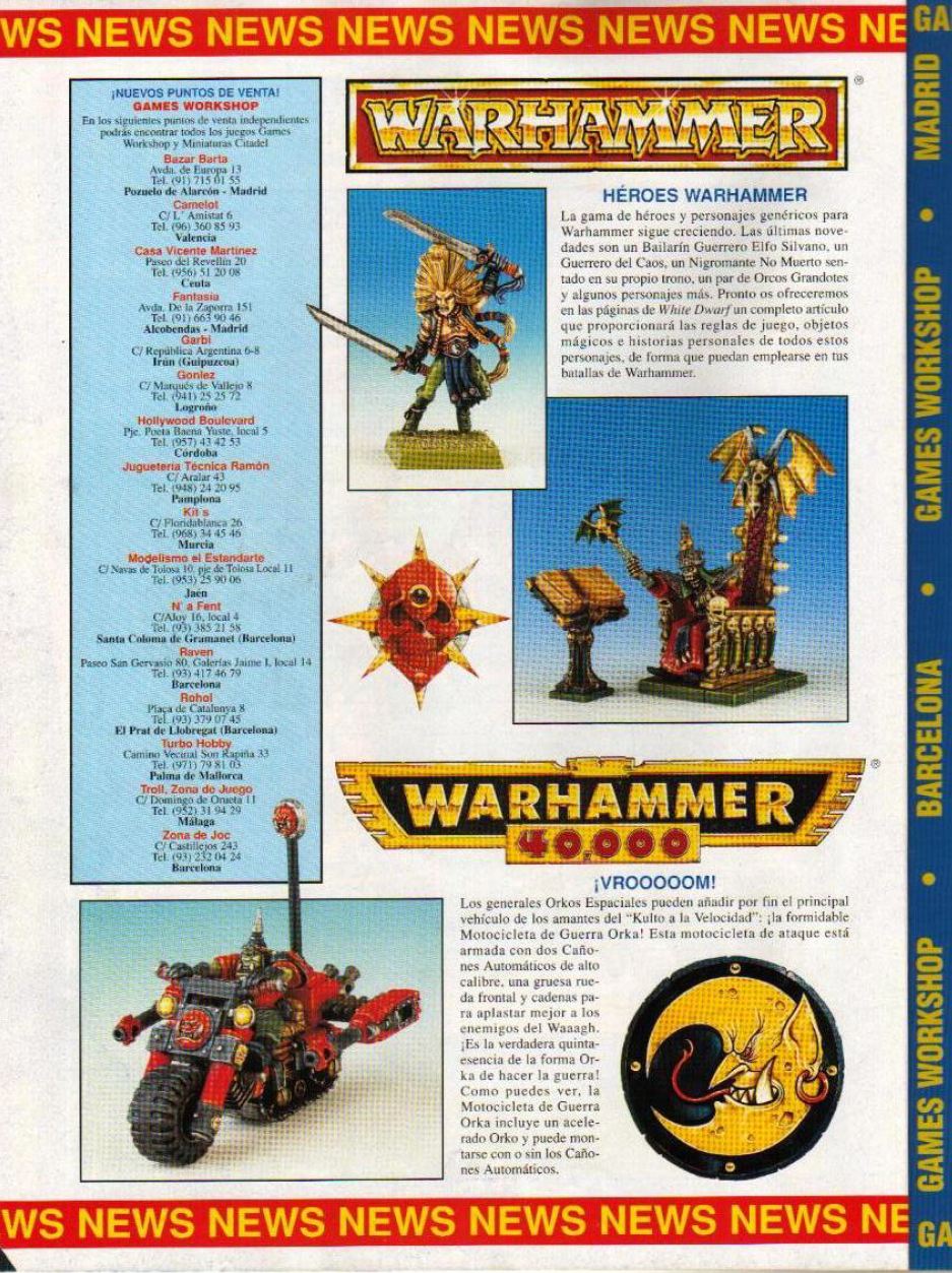 Entre las novedades, había «héroes Warhammer» que, en realidad, eran miniaturas de Warhammer Quest; veíamos las nuevas motos pielesverdes, y se anunciaban eventos en diversas tiendas. Este número anunciaba también la apertura de la tercera tienda oficial Games Workshop (y la segunda en la Ciudad Condal). Tengo mucho cariño a la tienda de Glòries, porque es la primera tienda en la que entré, y fue precisamente ese año, 1996. Yo ya conocía Warhammer del novio de una novia que tuve, y no le presté mucha atención, pero en 1996 entré en la tienda y me llevé un catálogo publicitario a casa que aún conservo (era finales del ’96 porque ya salía la caja de Quinta Edición de Warhammer). Pero hoy no toca hablar de esto, tampoco 😀