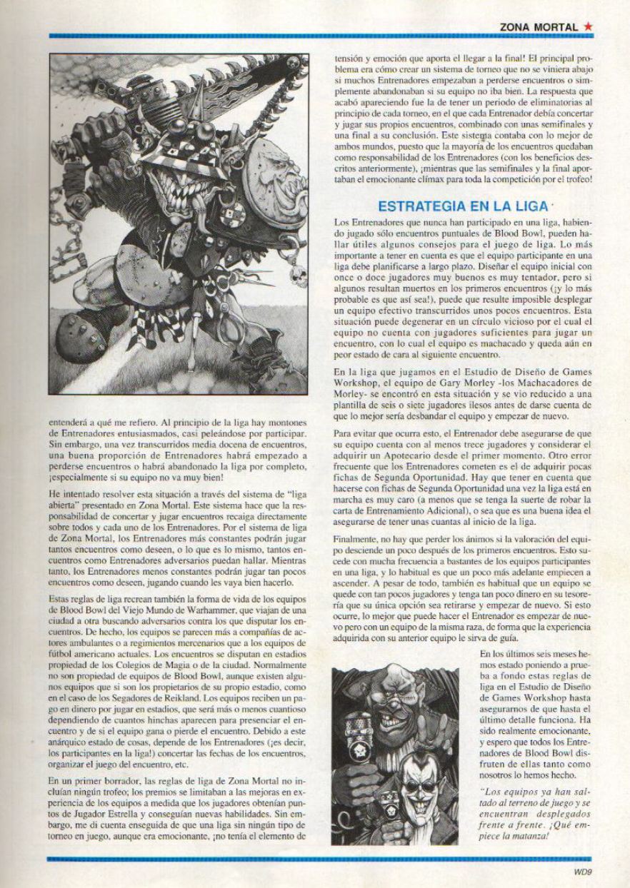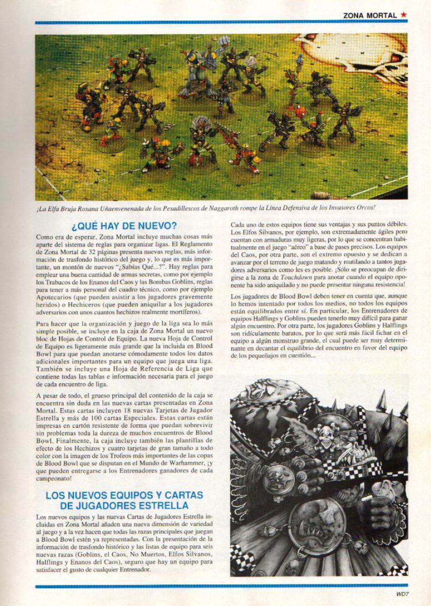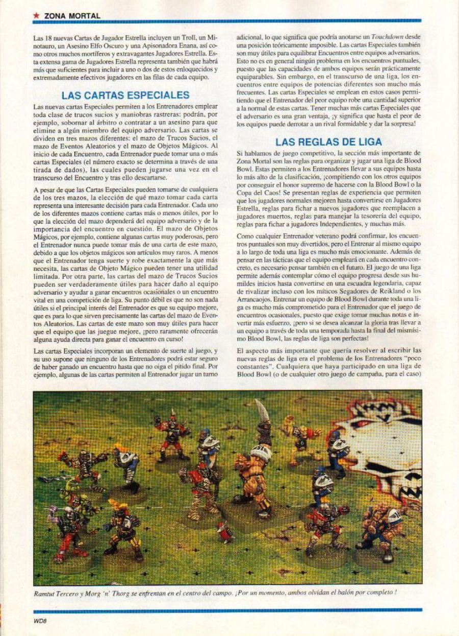 Teníamos un artículo hablando de Zona Mortal, la expansión a Blood Bowl (juego que había salido hacía poco). Zona Mortal contenía un montón de cartas y reglas nuevas, tanto miniaturas (hechiceros) como equipos, o instrucciones para jugar una liga. Con el tiempo (¿1999 si no recuerdo mal?), la caja de Blood Bowl pasó a incluir también Zona Mortal. En el fondo, no dejaba de ser un artículo-publicidad de algo nuevo, pero la revista era el mejor escaparate para este tipo de productos.