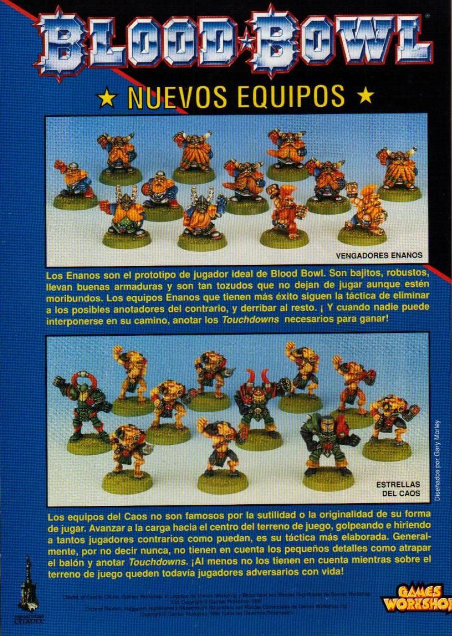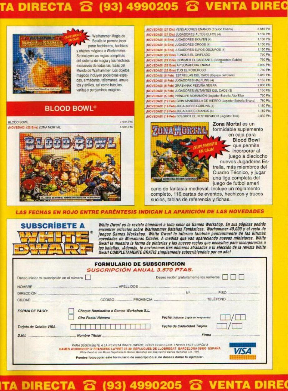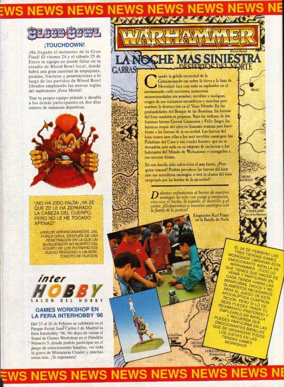 Teníamos un artículo hablando de Zona Mortal, la expansión a Blood Bowl (juego que había salido hacía poco). Zona Mortal contenía un montón de cartas y reglas nuevas, tanto miniaturas (hechiceros) como equipos, o instrucciones para jugar una liga. Con el tiempo (¿1999 si no recuerdo mal?), la caja de Blood Bowl pasó a incluir también Zona Mortal. En el fondo, no dejaba de ser un artículo-publicidad de algo nuevo, pero la revista era el mejor escaparate para este tipo de productos.