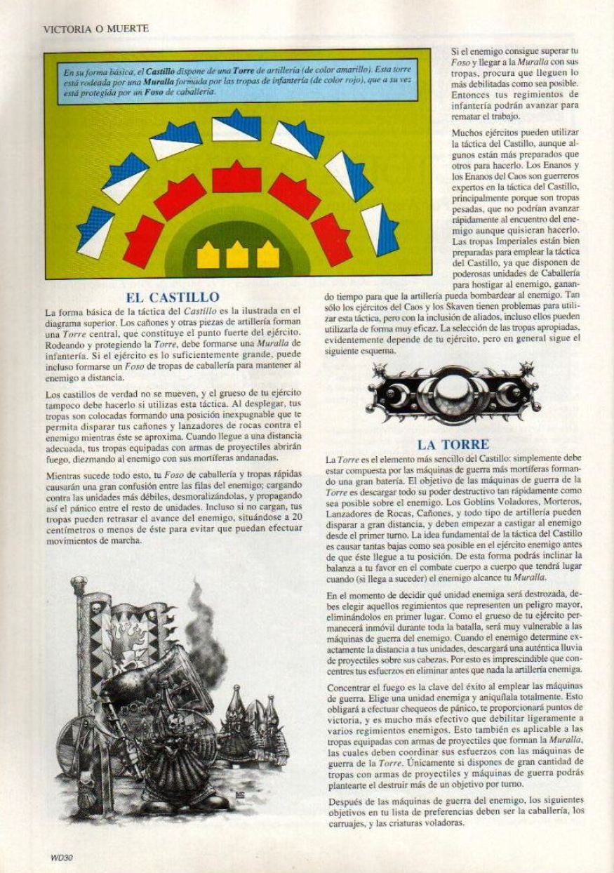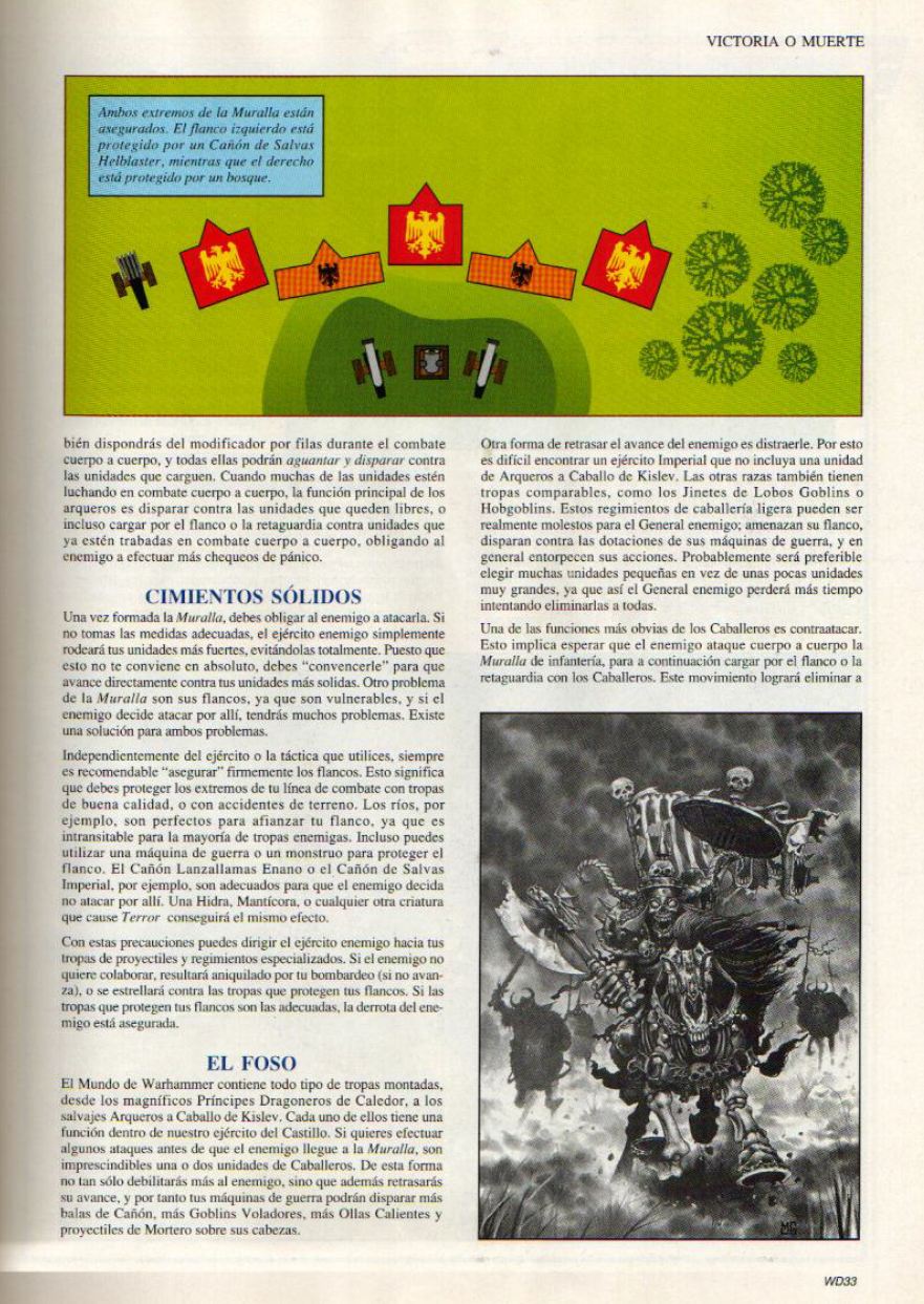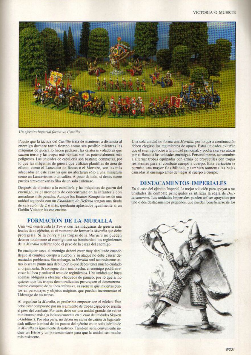De Warhammer no había mucho contenido (para variar), pero al menos era interesante. Por una parte nos daban las reglas de Morglum Quiebracuellos (novedad del mes), y por otra un (para su época) buen artículo de estrategia sobre cómo jugar con el Imperio y los distintos tipos de despliegue variaciones de «castillo». Mucho mejor que el número anterior.