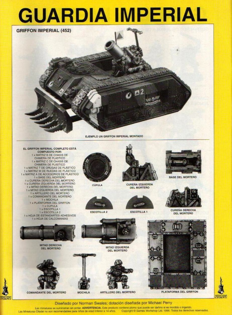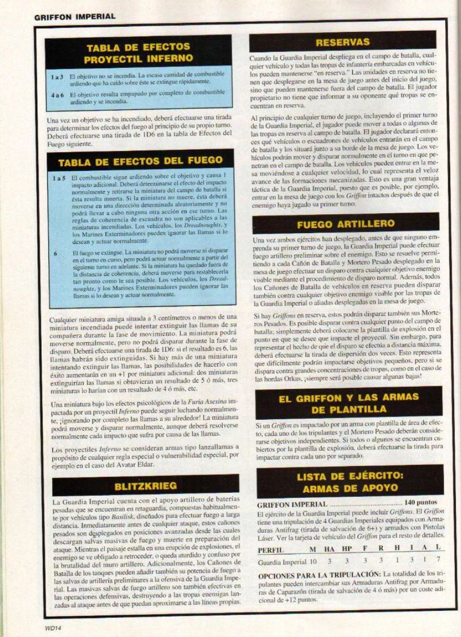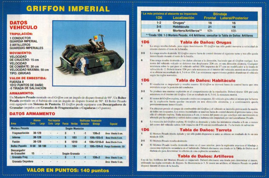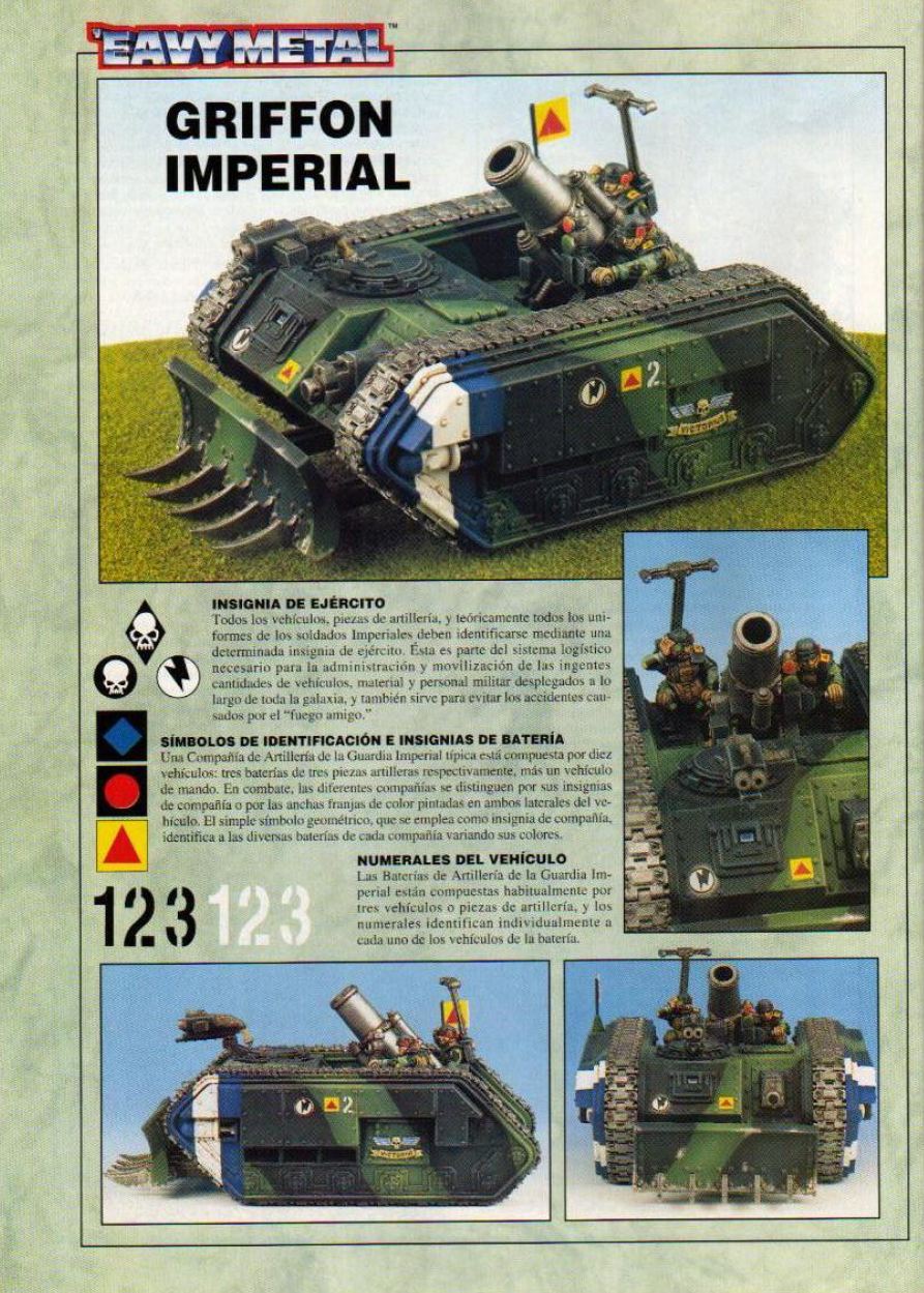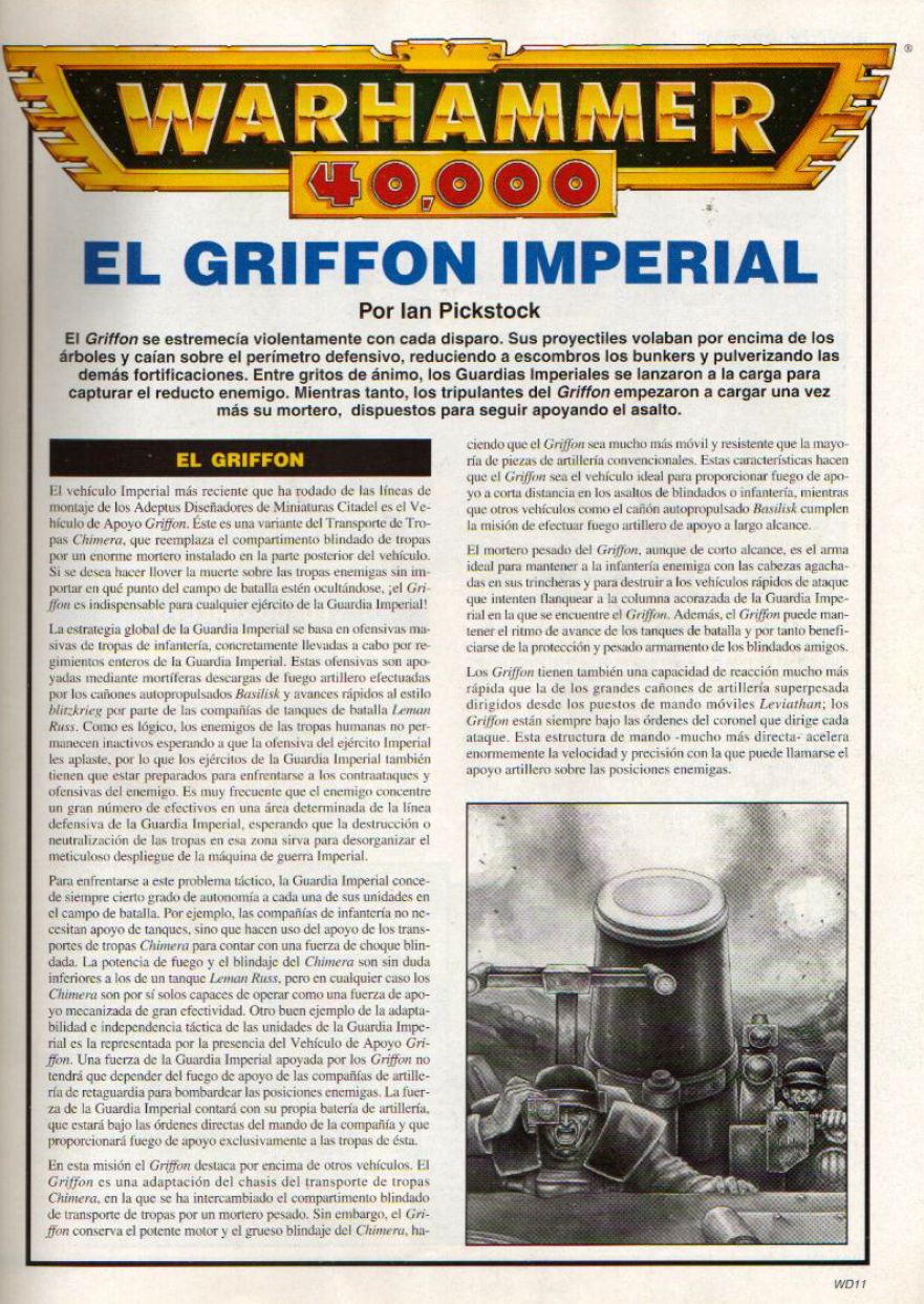 Warhammer 40.000 era, de nuevo, el plato principal de la White Dwarf. Hacía poco que había salido el códex de Guardia Imperial, así que había que anunciar todo lo posible a la Gloriosa. Había cinco páginas dedicadas al Griffon, incluida la hoja de datos que vemos aquí (y que algún recién llegado quizá la ve como complicada).