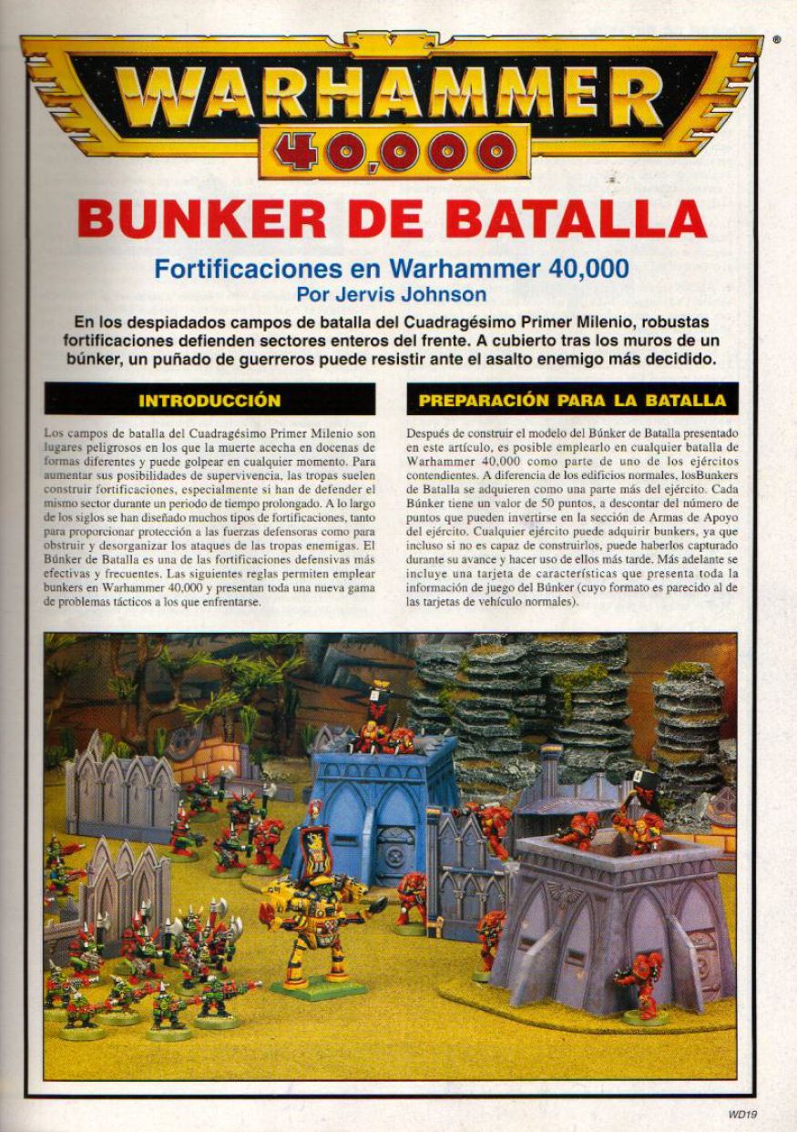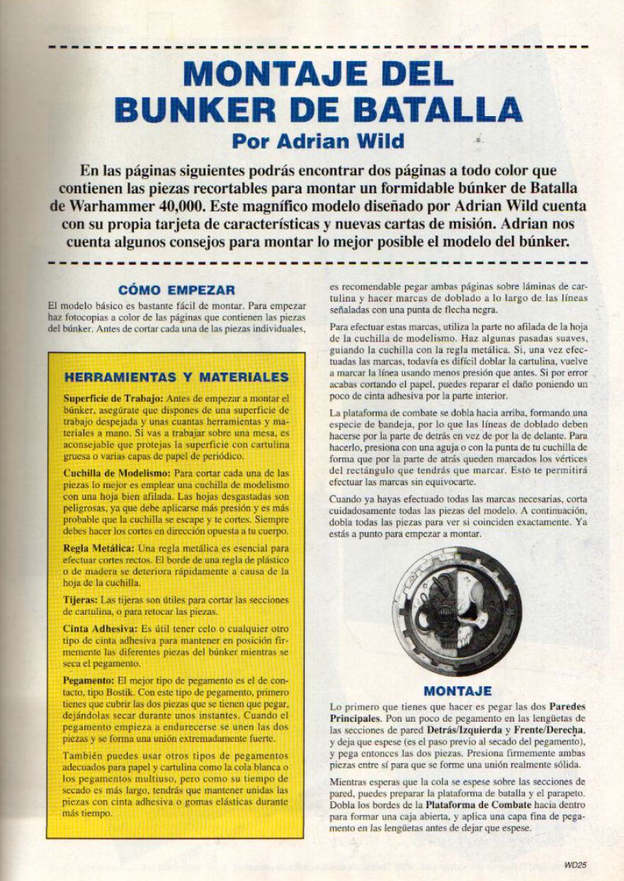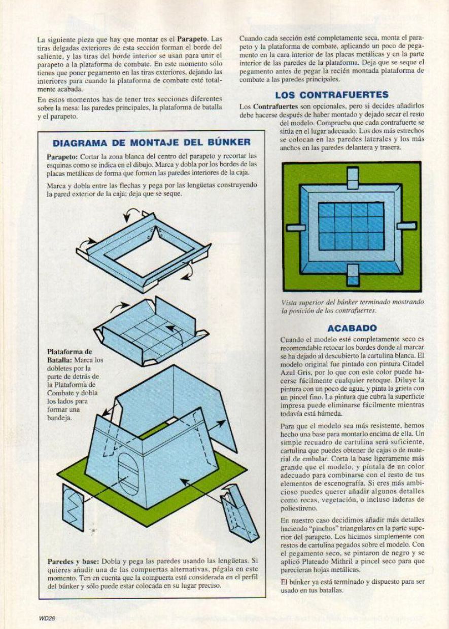 Pero, y aquí hay que aplaudir, es que además venía un búnker para que lo pudieras recortar para jugarlos en tus partidas. Los que no lleváis tiempo en el hobby igual lo veis raro, pero en aquella época (de hecho desde los ’80 hasta mediados de los ’00) la escenografía solía ser de cartón, hubo varios libros de «construye tu escenografía» editados por Games Workshop, y salieron unos cuantos suplementos que tenían casas recortables (incluyendo cajas de inicio), en vez de edificios de plástico como es actualmente. Pues bien, en algunas White Dwarf introducían cositas como esta, escenografía para que pudieras fotocopiarla y usarla en tus partidas. Era otra época.