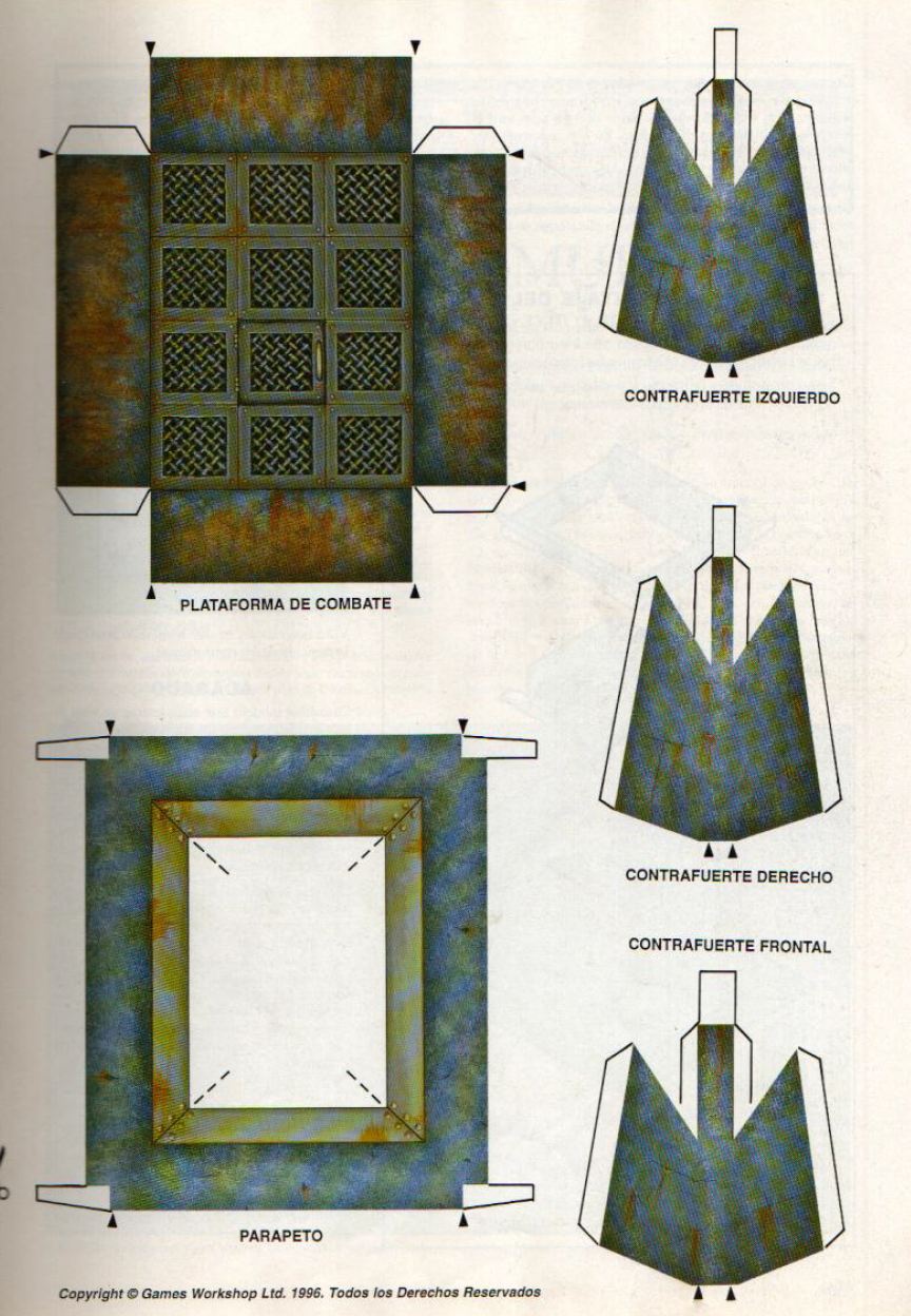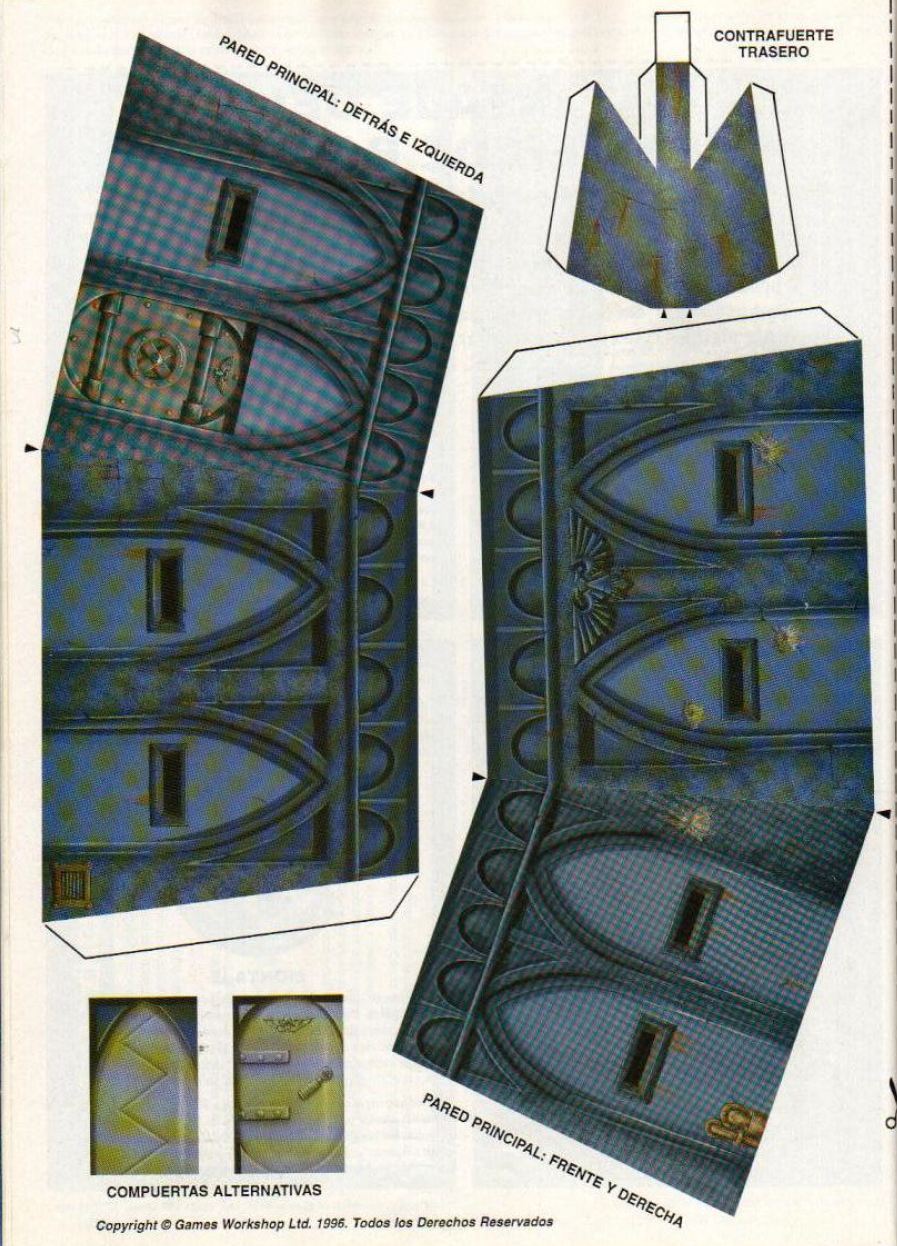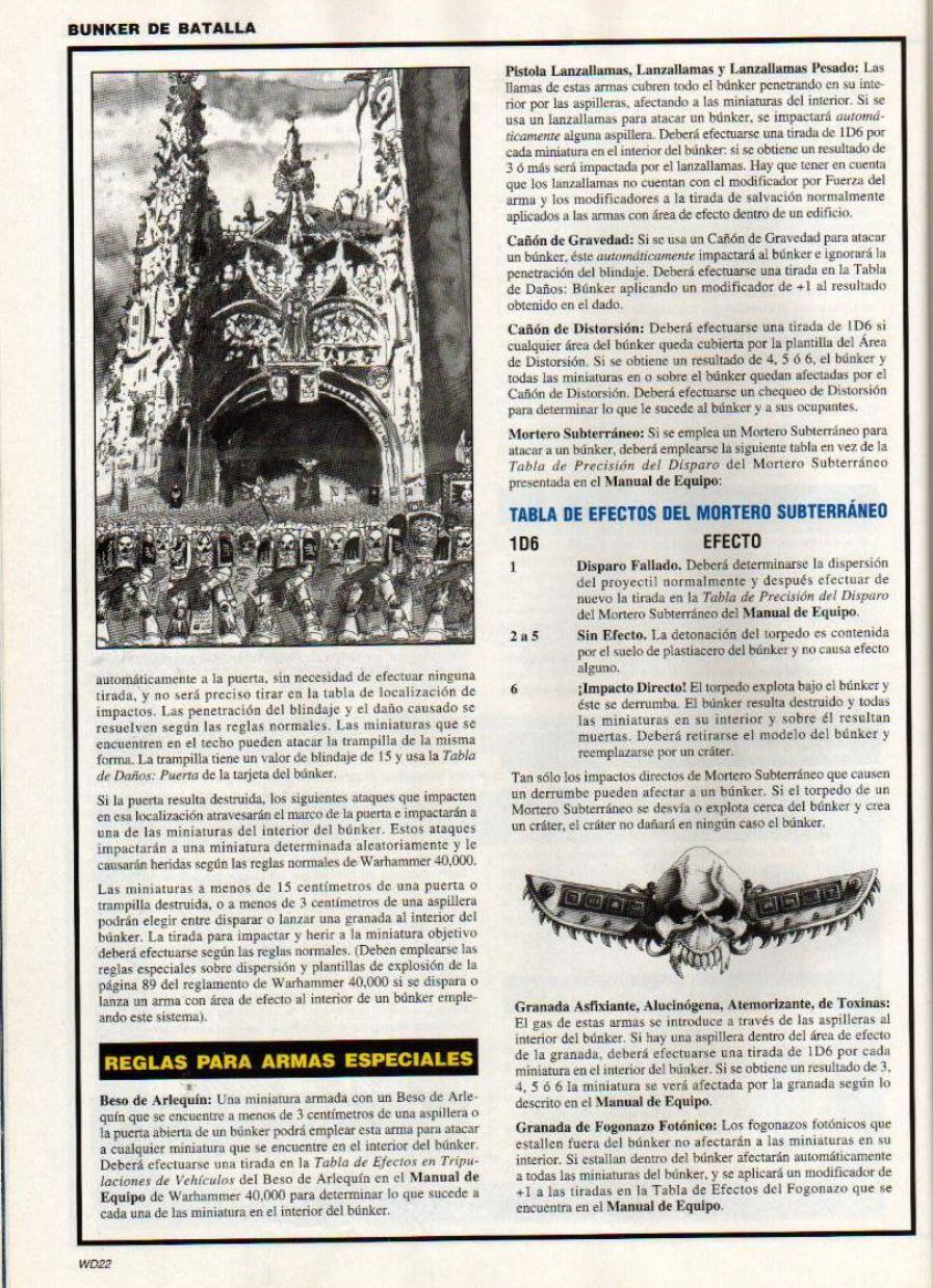 Pero, y aquí hay que aplaudir, es que además venía un búnker para que lo pudieras recortar para jugarlos en tus partidas. Los que no lleváis tiempo en el hobby igual lo veis raro, pero en aquella época (de hecho desde los ’80 hasta mediados de los ’00) la escenografía solía ser de cartón, hubo varios libros de «construye tu escenografía» editados por Games Workshop, y salieron unos cuantos suplementos que tenían casas recortables (incluyendo cajas de inicio), en vez de edificios de plástico como es actualmente. Pues bien, en algunas White Dwarf introducían cositas como esta, escenografía para que pudieras fotocopiarla y usarla en tus partidas. Era otra época.