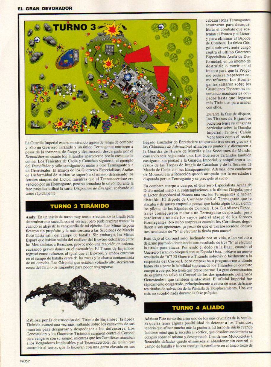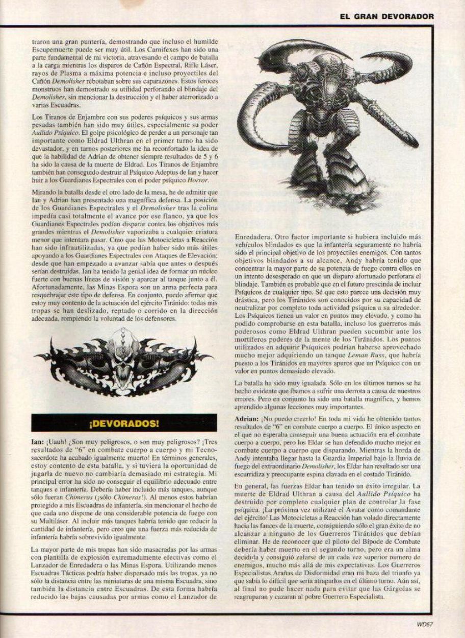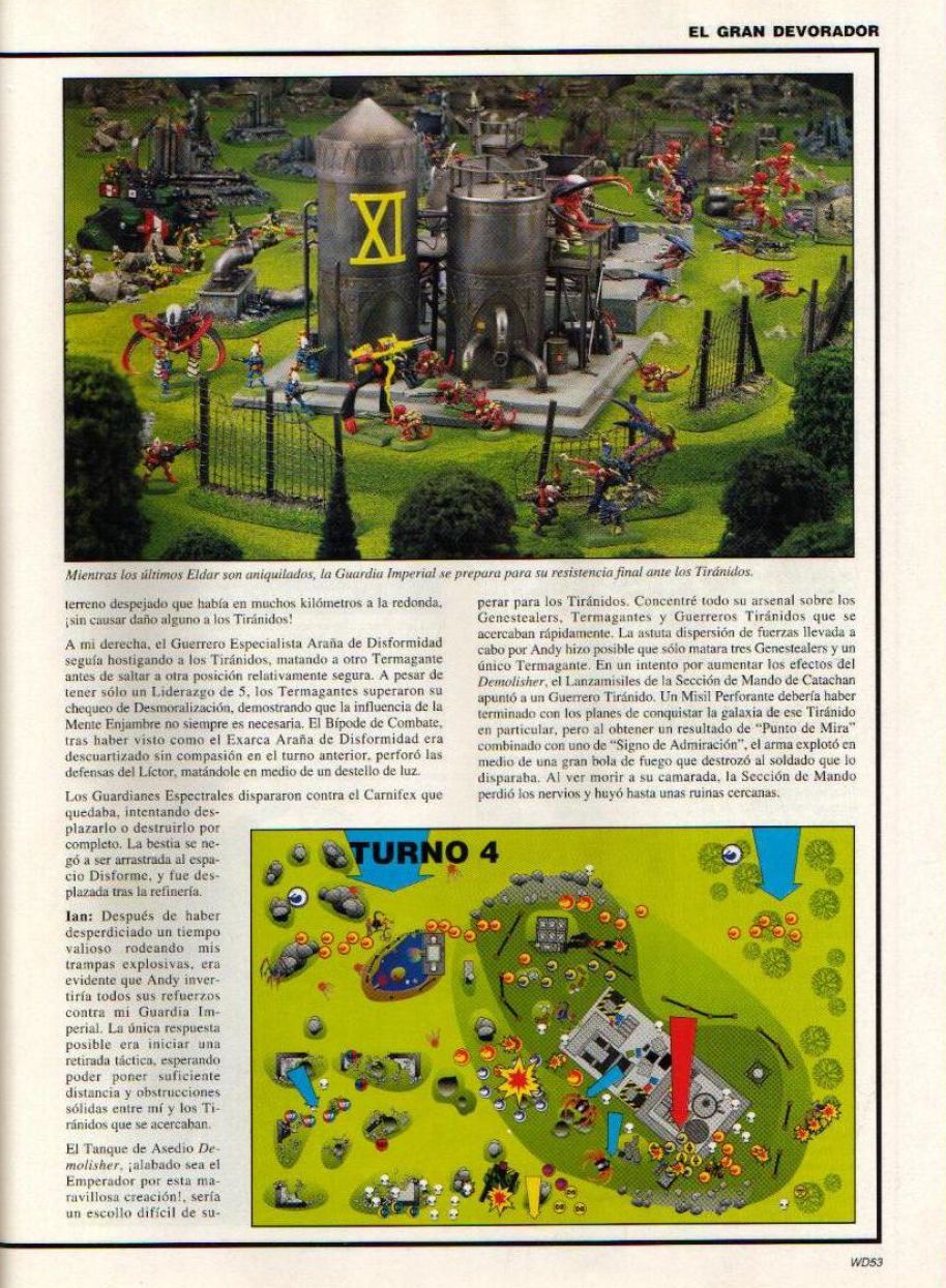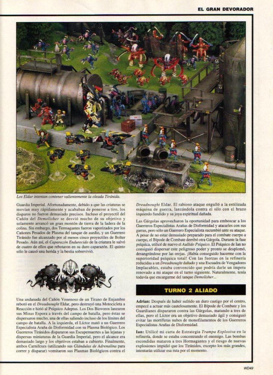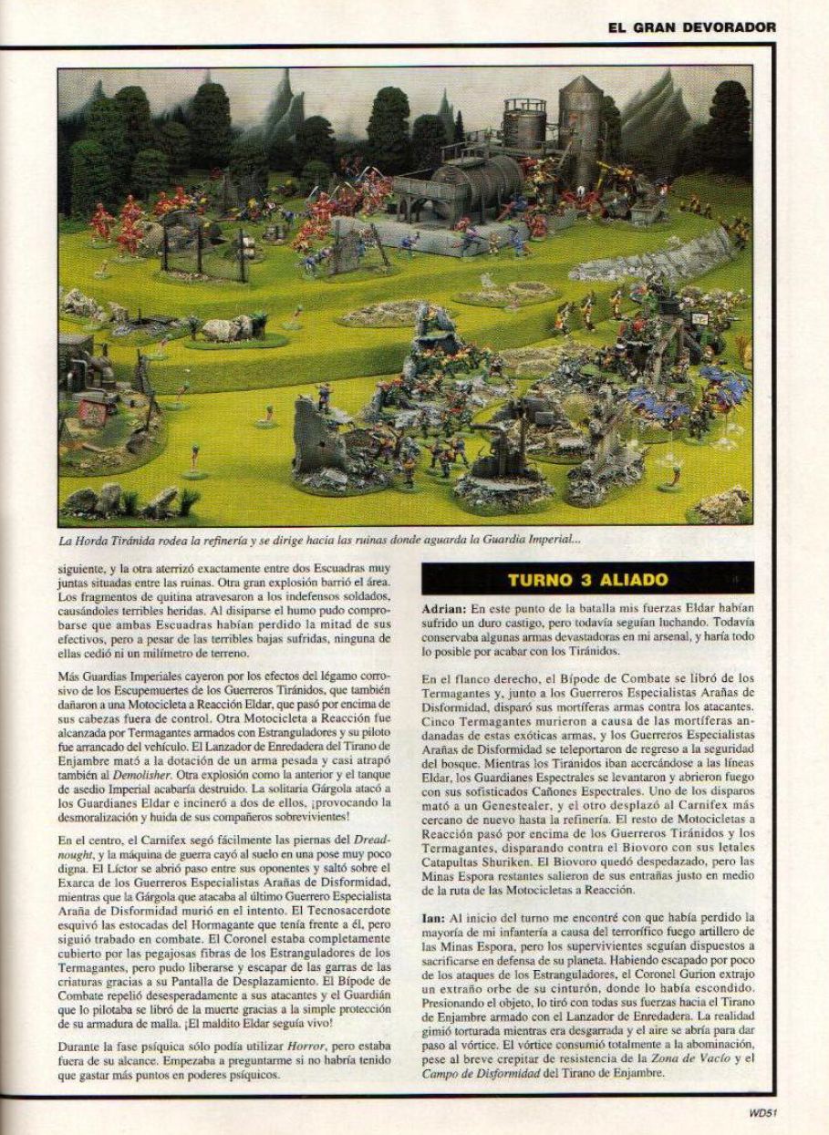 El plato fuerte de cada número solía ser el informe de batalla, y en este caso volvíamos a tener un informe de batalla del cuadragésimo primer milenio, enfrentando las gambas espaciales contra una alianza de Gloriosa y Eldars.