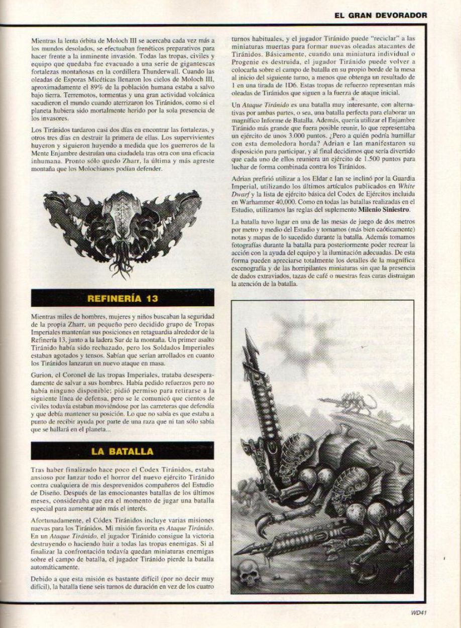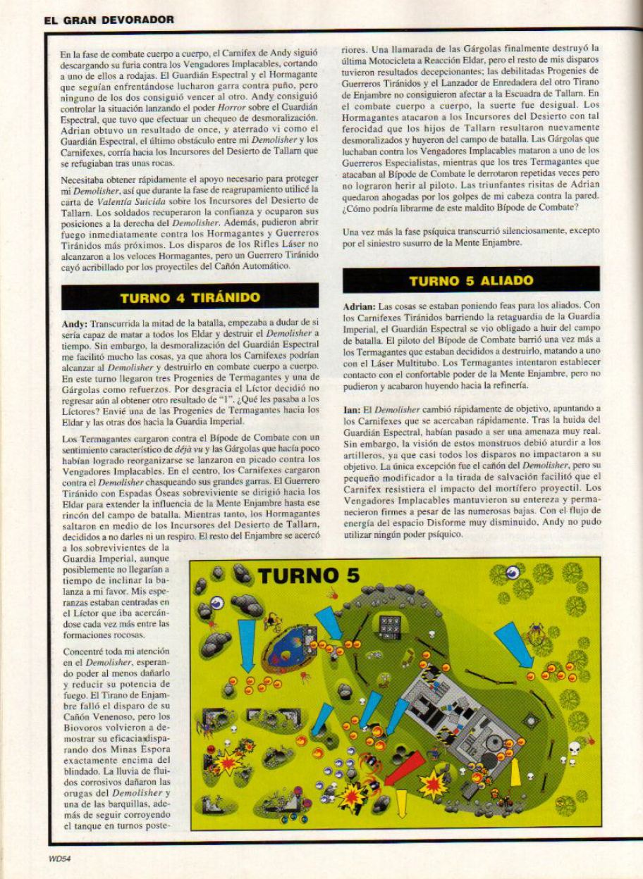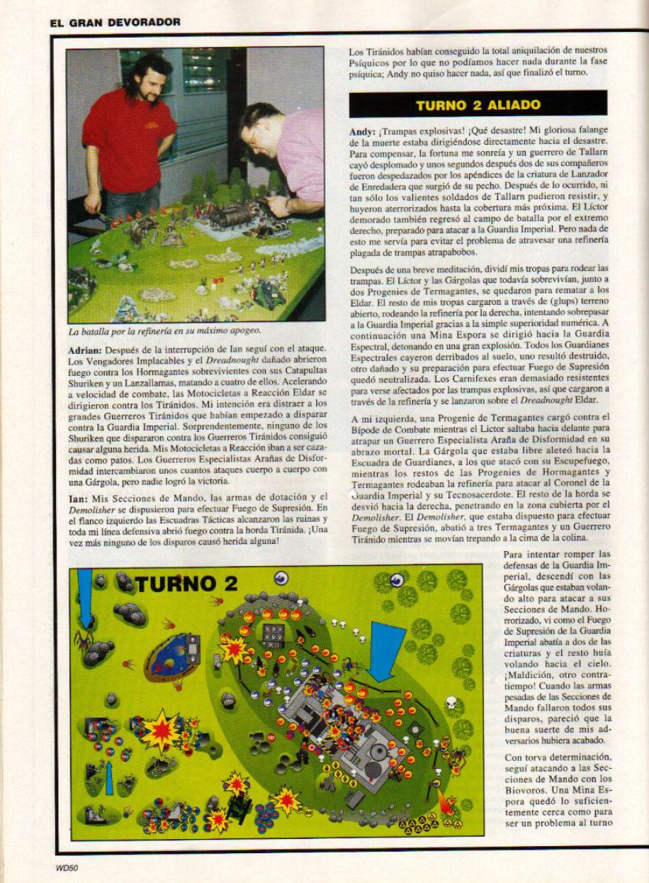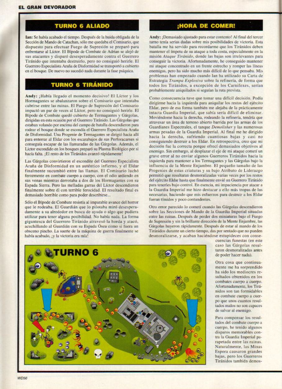 El plato fuerte de cada número solía ser el informe de batalla, y en este caso volvíamos a tener un informe de batalla del cuadragésimo primer milenio, enfrentando las gambas espaciales contra una alianza de Gloriosa y Eldars.