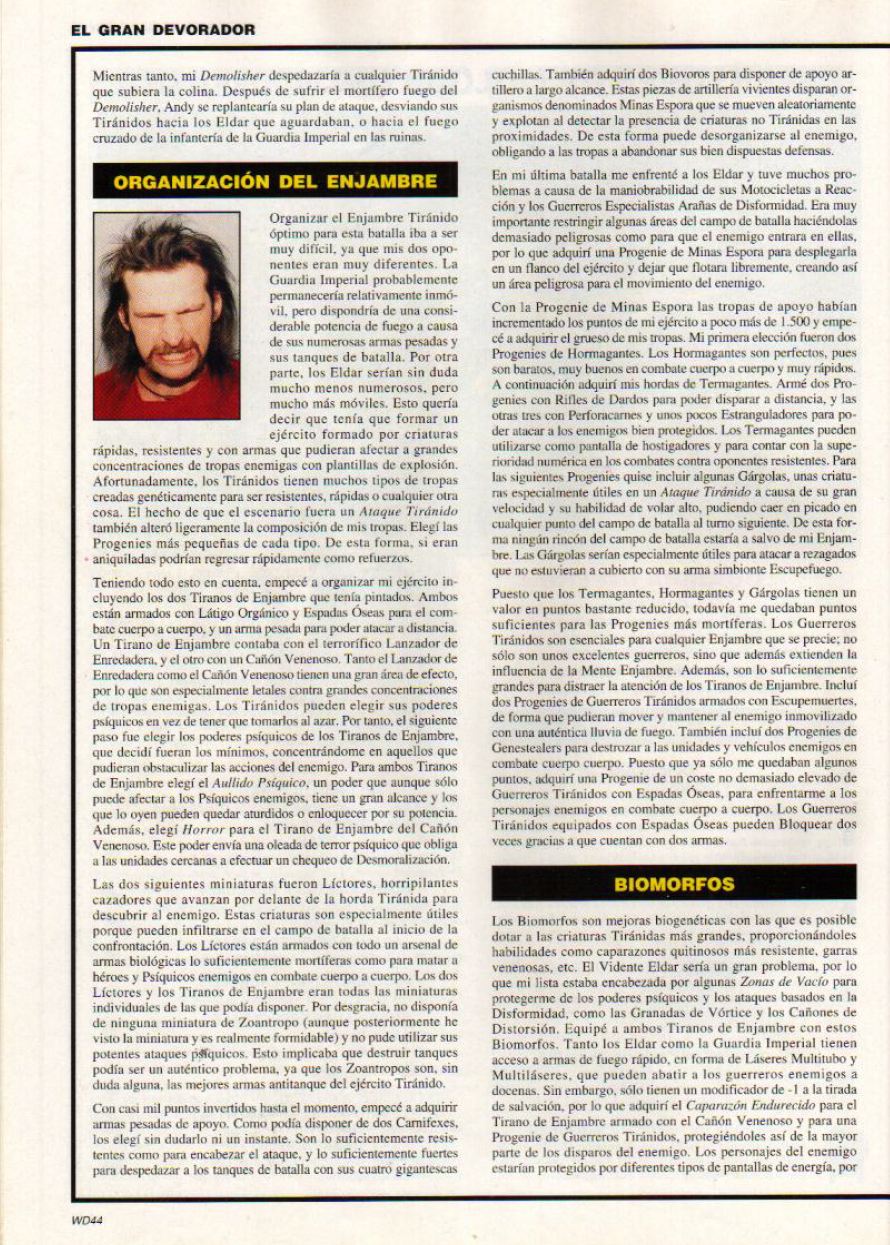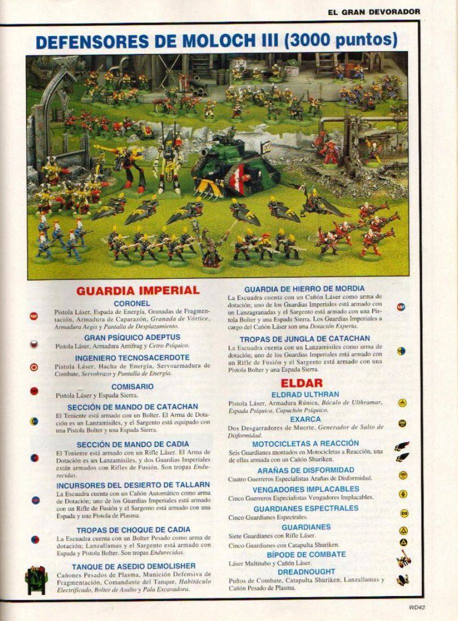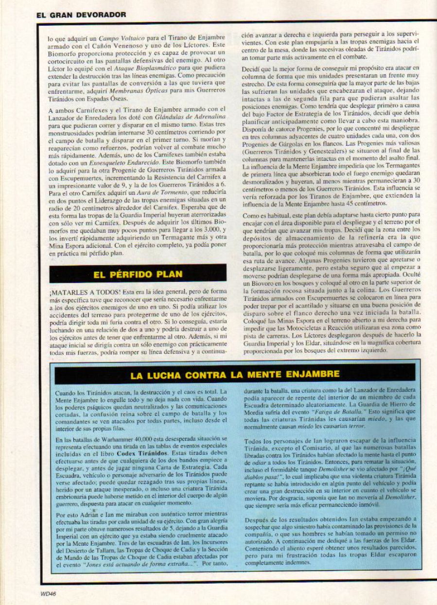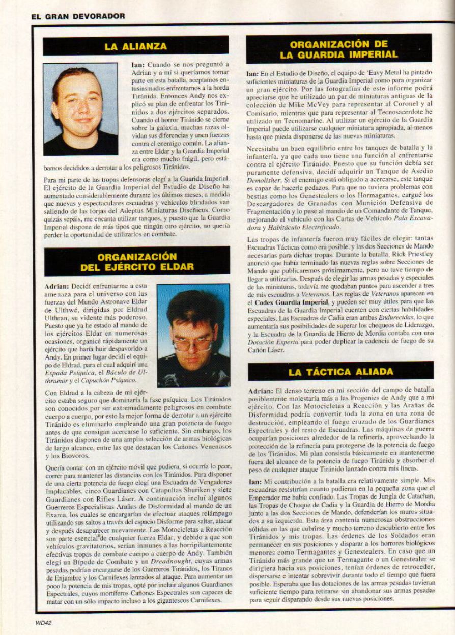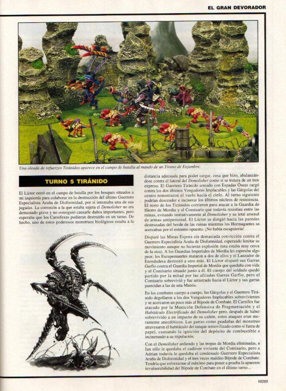 El plato fuerte de cada número solía ser el informe de batalla, y en este caso volvíamos a tener un informe de batalla del cuadragésimo primer milenio, enfrentando las gambas espaciales contra una alianza de Gloriosa y Eldars.