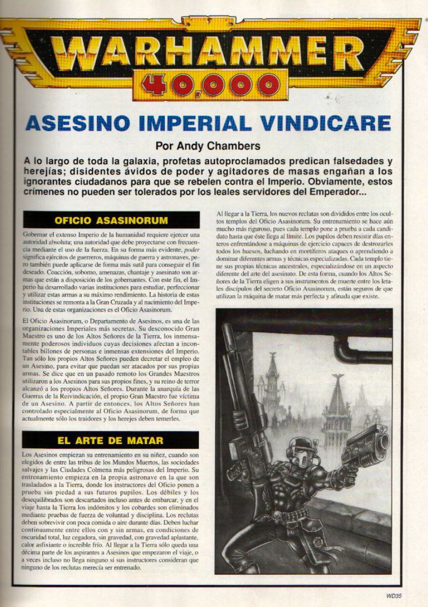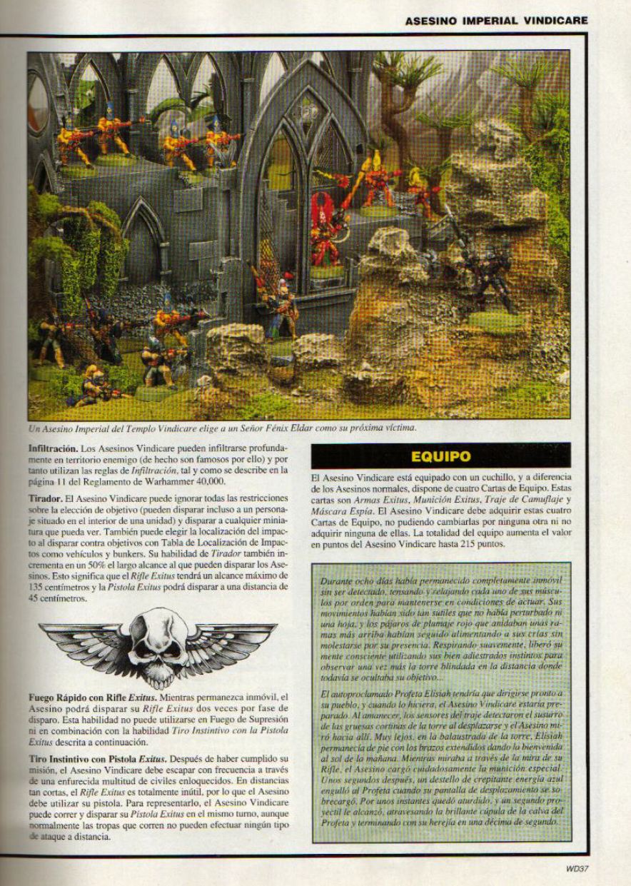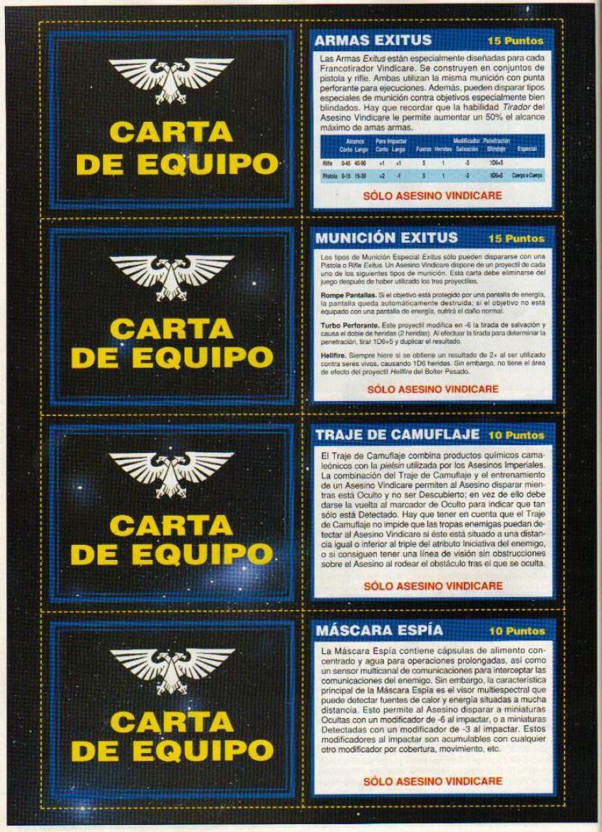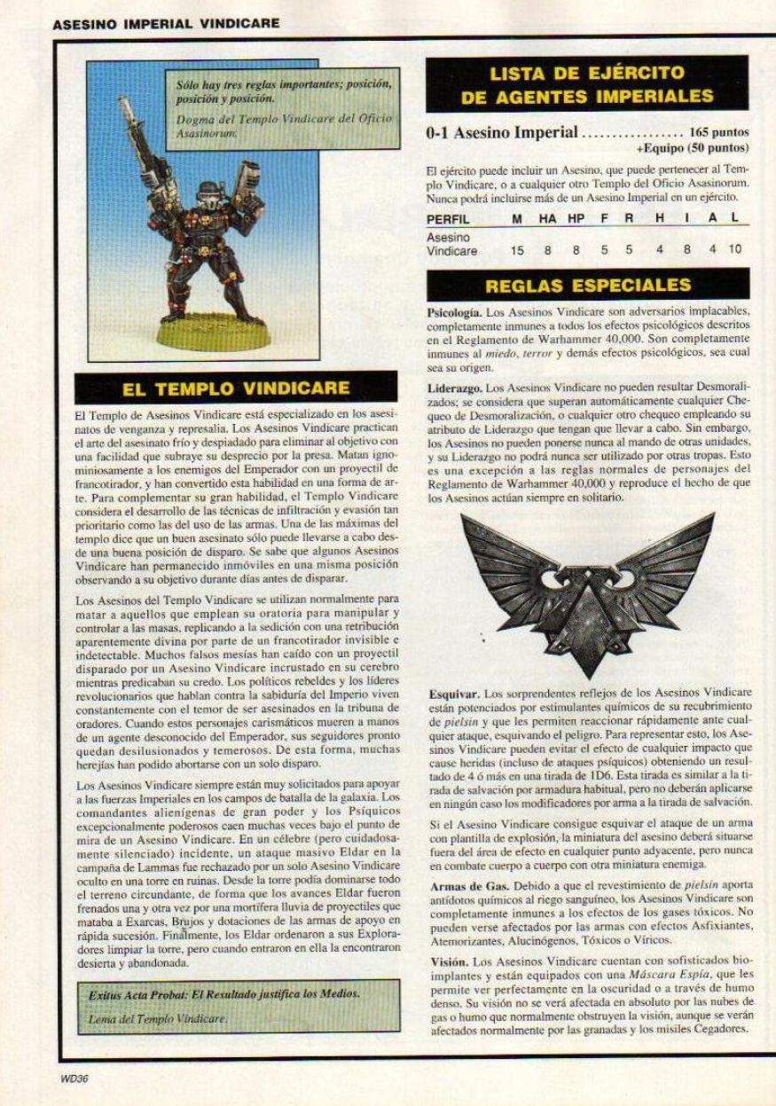 Siguiendo con el cuadragésimo primer milenio, se incluían en este número de la revista las reglas para poder usar al Asesino Vindicare en tu ejército imperial. Incluso venían las cuatro cartas de equipo que podías usar en tu batalla.