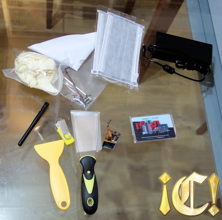 La caja que pone «toolkit» es un poco de todo. Viene el cargador, una espátula (o rasqueta) de metal y otra de plástico, guantes, un USB, una tarjeta que supongo que tendrá descuento de alto, unos filtros para aprovechar la resina cuando cambias la película, unos tornillos y llaves Allen, y unas mascarillas para ir al médico (porque si te piensas que protegen de algo los vapores de resina…).