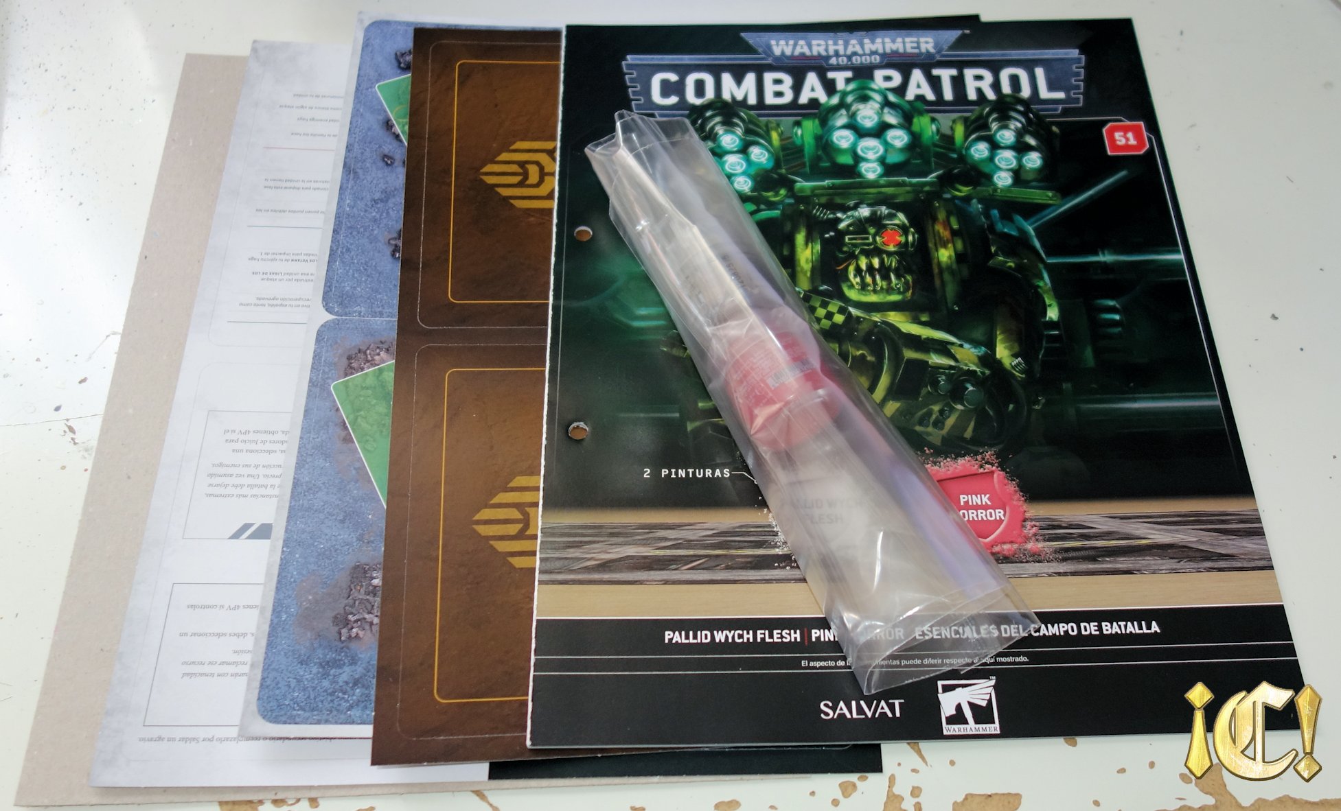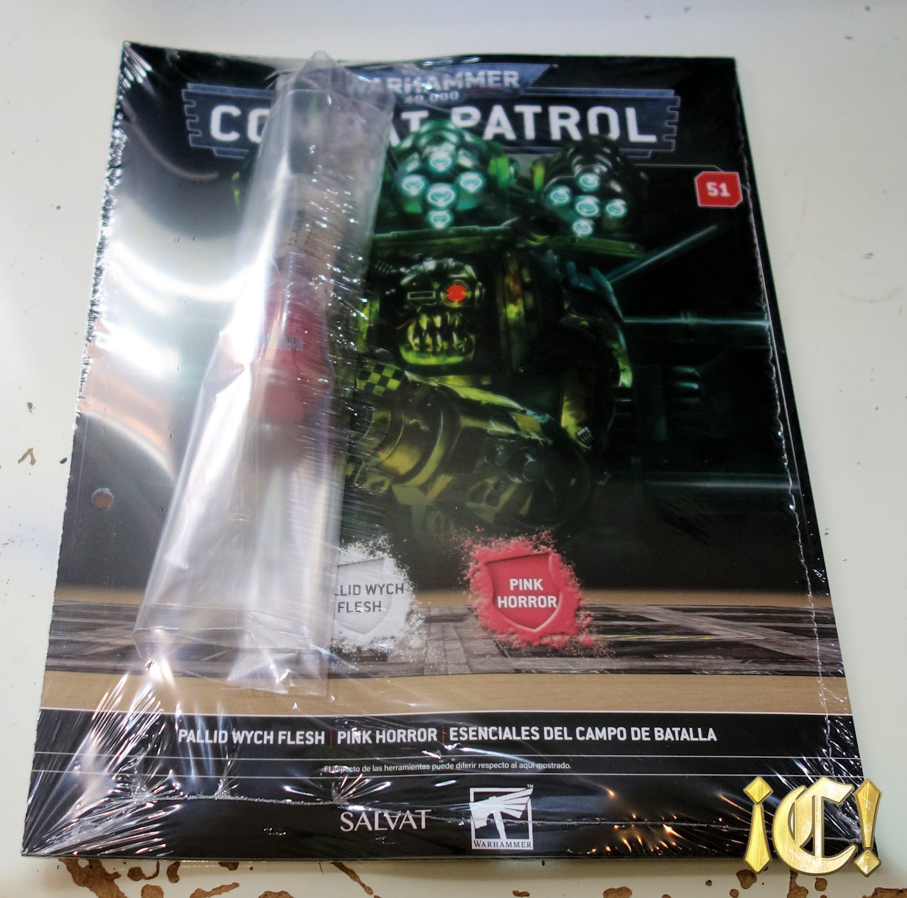 Lo primero que podemos observar es que este número incluye dos pinturas Layer: Pink Horror y Pallid Wych Flesh. Por desgracia, además de ser un número «con pérdidas» (7.20€ de gadget, pagando 10.99€), son dos pinturas Layer que se usan poco y, si ya tienes de anteriores coleccionables, igual las tienes prácticamente llenas y se van a la caja de «pinturas de reserva que quizá nunca uso». Hay pinturas Base y (sobre todo) las Contrast y algunas Technical, son pinturas que se usan mucho, muchísimo (aunque tengo ya cuatro Maccgrage Blue), pero las Layer, al menos en mi caso, las uso muy poco (y si encima son «de recambio» porque ya las tengo en mis pinturas habituales, se van a una caja metálica donde permanecen dormidas por una eternidad), por lo que a nivel de gadget a priori parece un número de los peores.