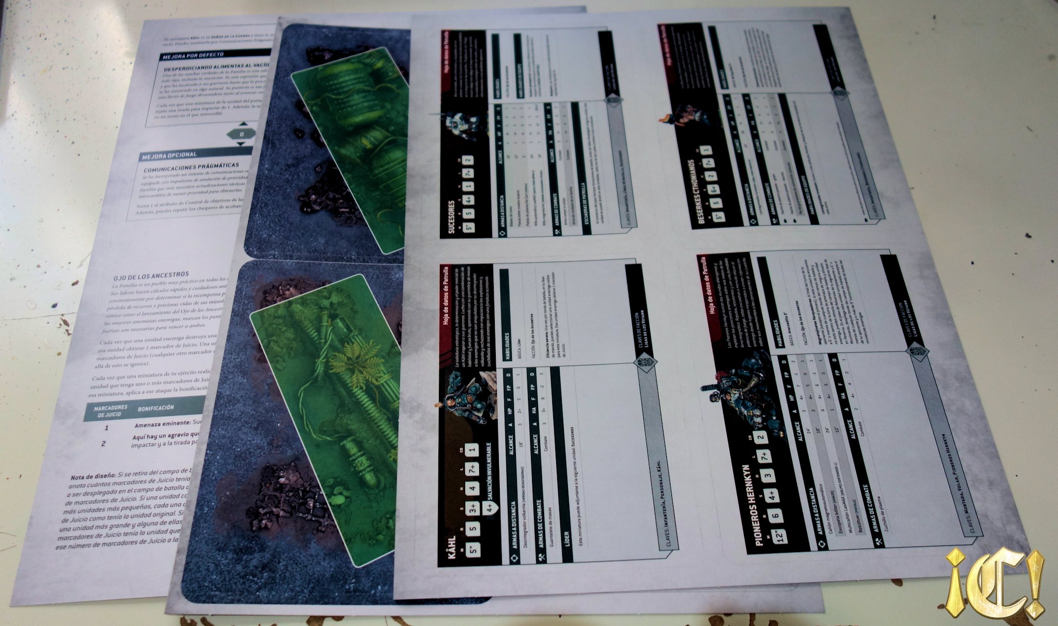 Pero no porque… ¡no son el único gadget! Se incluyen también las tarjetas de datos de algunas unidades (Votann), de escenografía, y de «añadidos a reglas». Que me jode decirlo pero a los jovenzuelos os irá muy bien, pero a los que tenemos presbicia («vista cansada») es una tortura y no nos sirve de mucho…