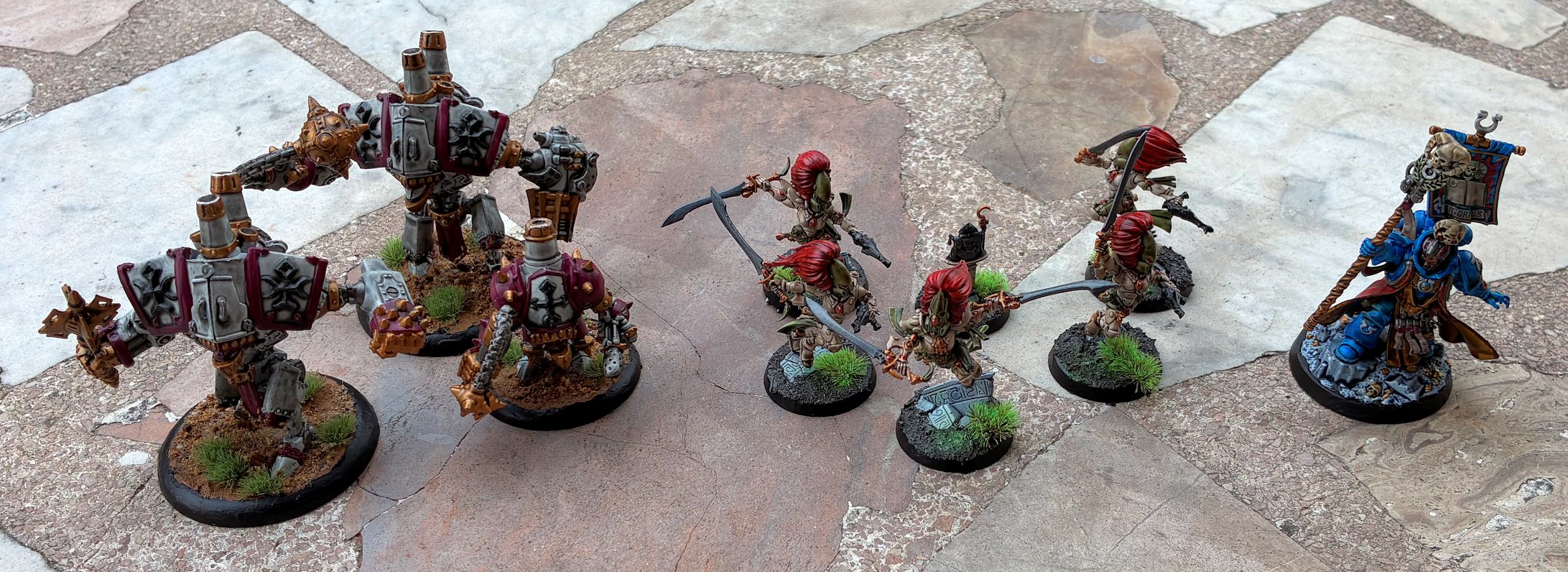 - Combat Patrol. Aquí sumamos siete miniaturas, subiendo el total a 18/140, un 13%. Son cosas que tenía pendientes (terminar Marines y Eldars), y no he llegado al grueso (Orkos) que me hará recuperar el verde (nunca mejor dicho).