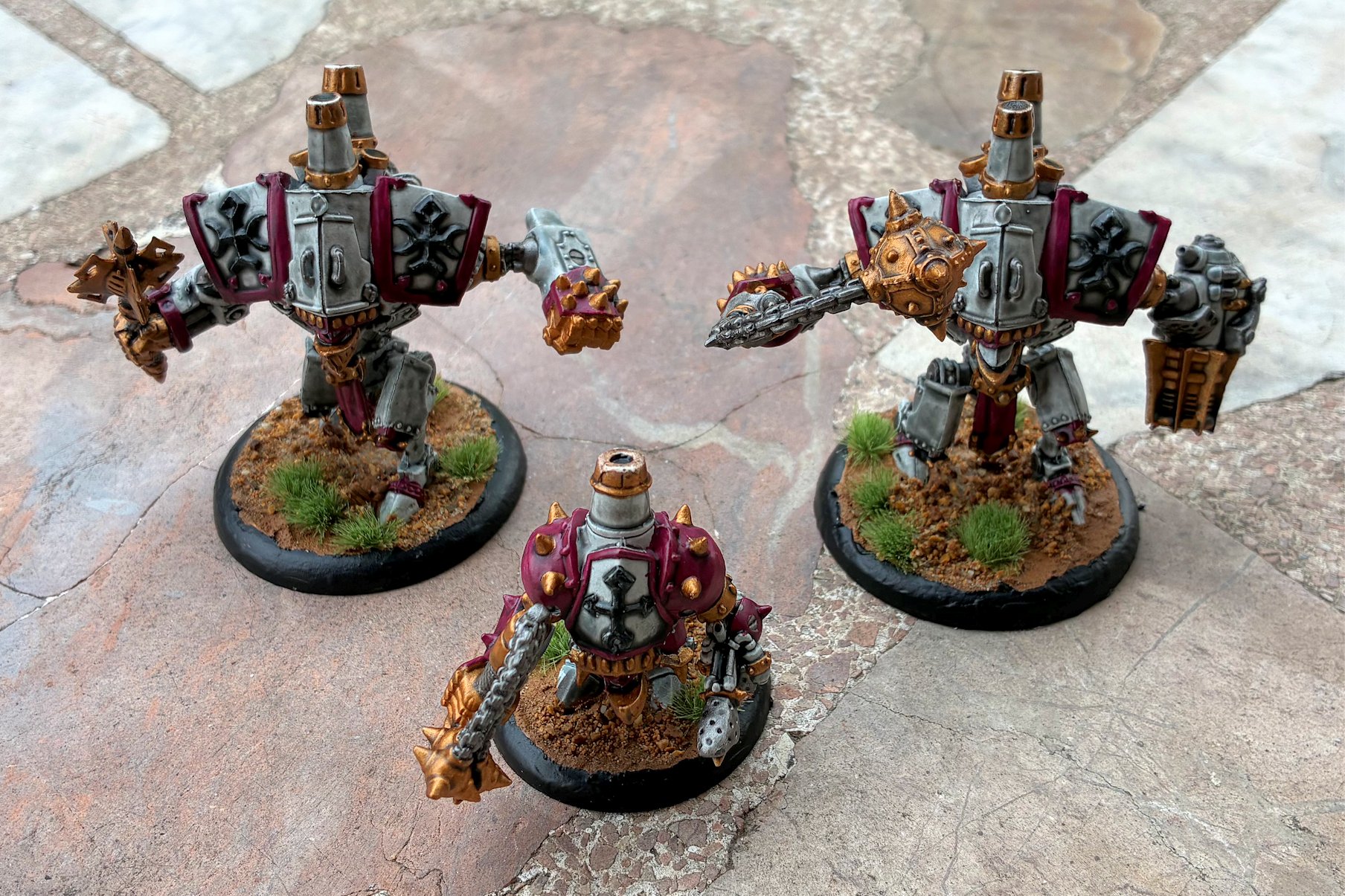Inicialmente pensaba pintar sólo un Siervo, pero dije «así tengo los tres de golpe». Se trata de los tres siervos del Protectorado de Menoth que tenía de antes de las compras de este mes: un Vencedor (Vanquisher, Siervo pesado), un Curzado (Crusader, Siervo pesado) y un Enmendador (Repenter, Siervo ligero). El Enmendador es de metal, mientras que los otros dos son de esa resina plástica que usaba Privateer hace quince años. Es curioso pero me lo estoy pasando mejor de lo que me pensaba, pintando Menoth. La capa base es la Contrast Apothecary White sobre todo el siervo, y luego repintar partes con metal o con Screamer Pink, con un Nuln para terminar. Sé que con esto ya podría jugar (al menos a mk1), ahora toca empezar con la infantería. No me preocupa haber pintado «pocas miniaturas», porque también son las más grandes.