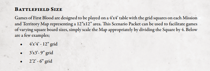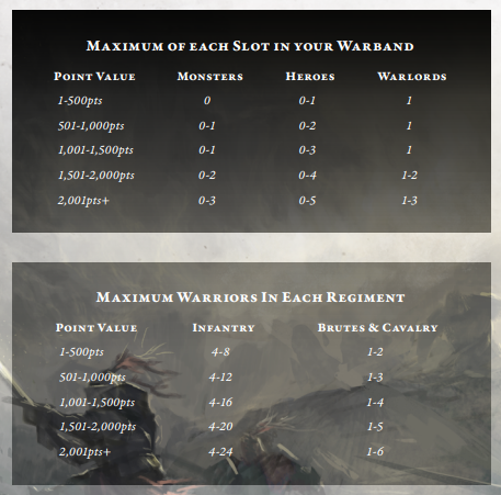 Así, en una partida ‘estandar, tendremos un caudillo, hasta dos héroes y un monstruo y ninguna unidad podrá tener más de 12 minis de infantería o 3 de brutos/caballería. Adicionalmente, una partida se podrá jugar en mesas de 120cm cuadrados o menos, siguiendo esta tabla: