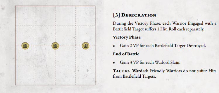 El ganador, tira un D3 para ver si puede elegir la misión, el despliegue o el encuentro. Sale 1, por lo que puede elegir la misión. Supongamos que elige la misión 3, desecrar.