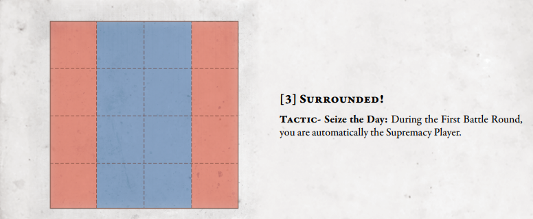 Así que, nominalmente, tendrás unas 216 combinaciones… miento. Porque resulta que hay otro aspecto más. Se introduce un nuevo concepto, las tácticas. Las tácticas se configuran como habilidades asociadas a una misión, a un tipo de despliegue y al encuentro. En toda partida, pues, habrá tres tácticas a elegir, pudiendo cada jugador elegir una táctica y los jugadores no pueden elegir la misma táctica.