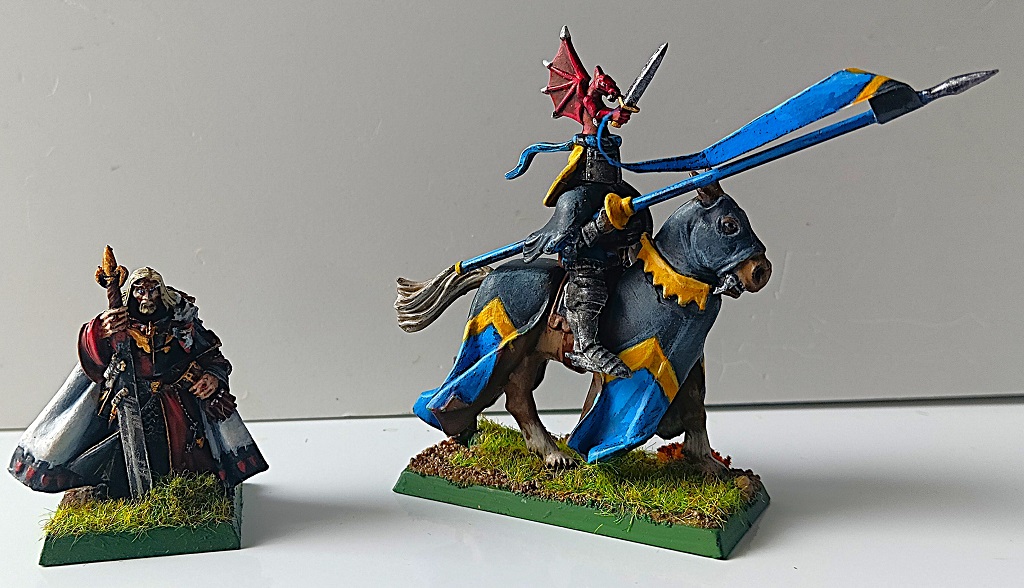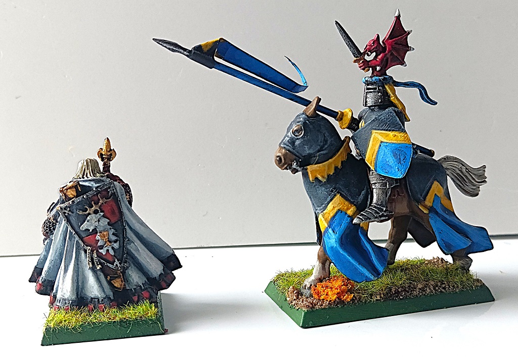 Bretonia: 2 miniaturas, las 2 de objetivos. El caballero a pie le tenía ya empezado del año pasado, pero el caballero del reino fue una inspiración al ver un escudo heráldico en Pinrest. En total 3 de 30, 10%, en rojo, pero va bien.