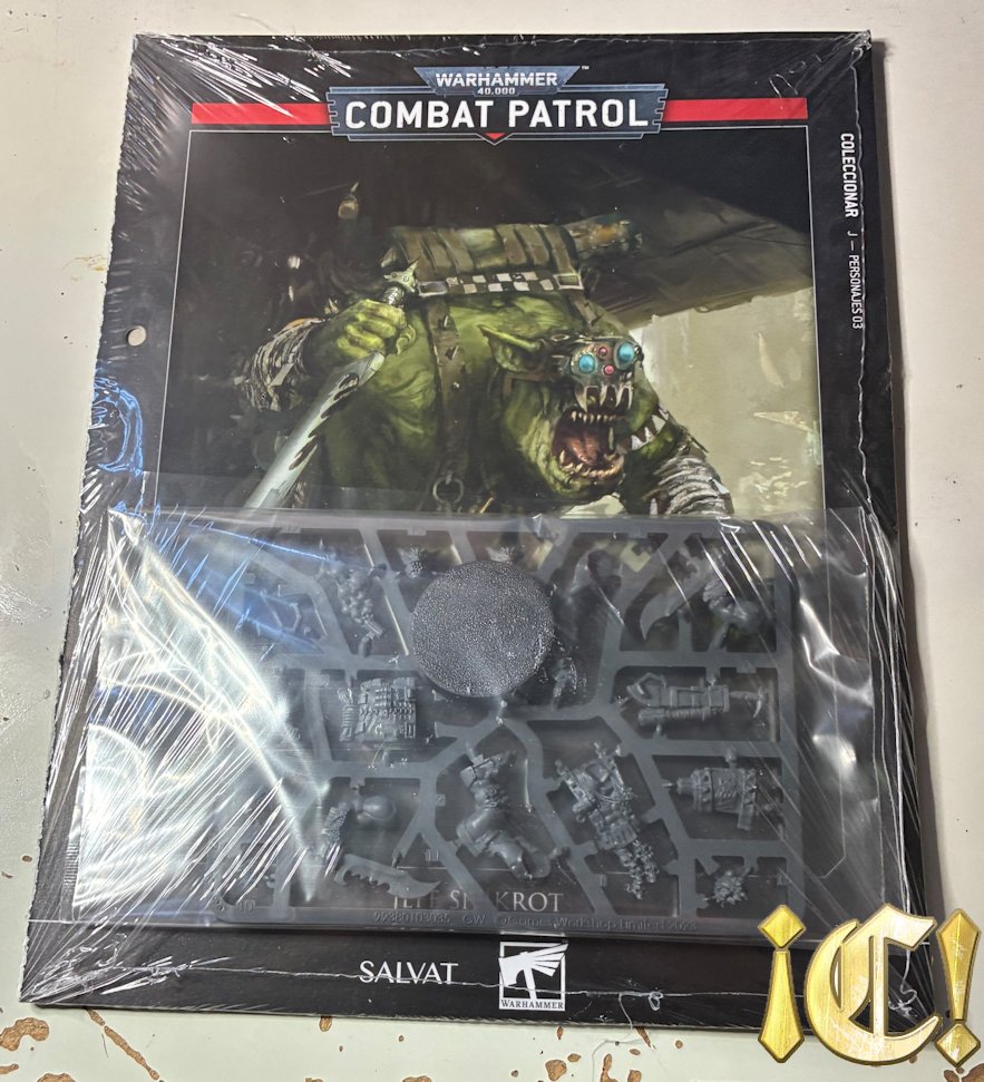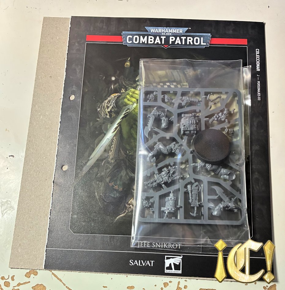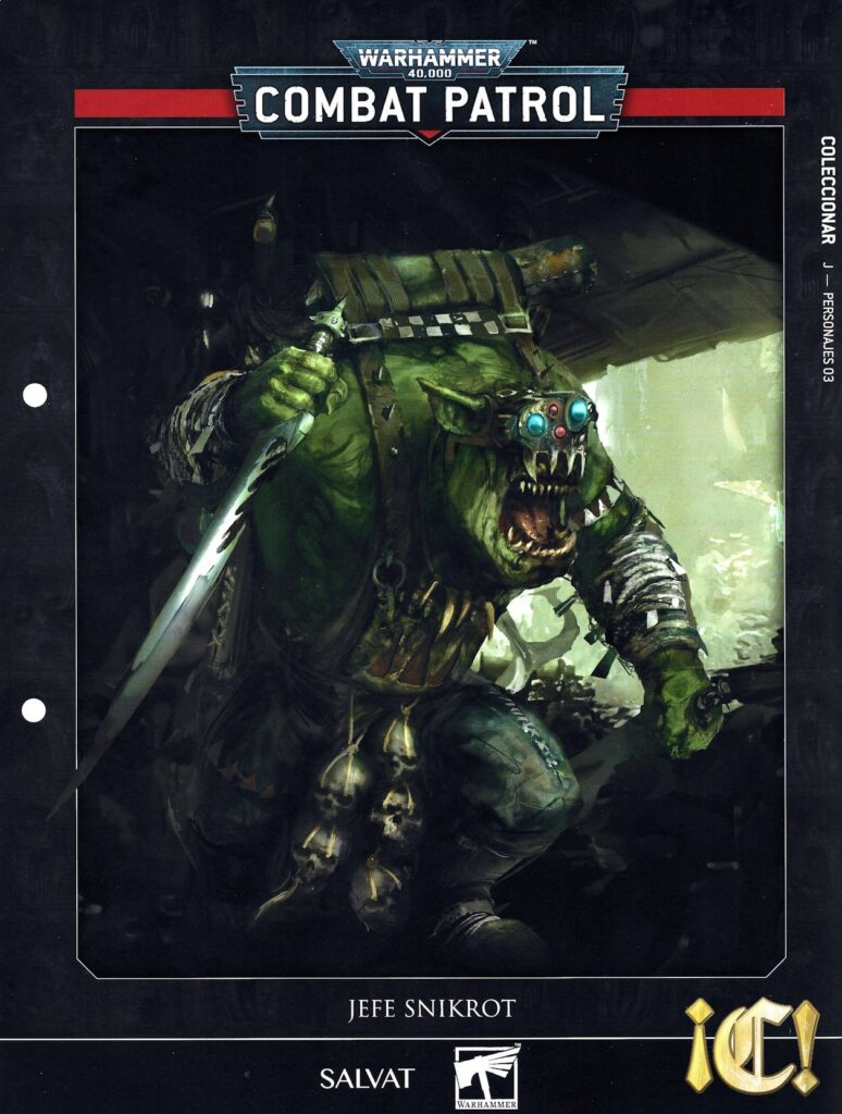 On-topic. Este número extra de Combat Patrol con una miniatura de personaje especial sigue el mismo esquema que Haarken o Tigurius. No voy a extenderme mucho. Se trata de miniaturas que vienen en una matriz relativamente pequeña, que tienen un ahorro considerable (Cuestan entre 30€ y 40€), que aunque puedan jugarse en solitario necesitan «refuerzos» (en este caso Komandoz), que son de montaje fácil, y que el fascículo queda muy cojo. Tiene montaje (2p), pintura (7p), foto grande de la mini montada y algo de trasfondo (2p), hoja de datos (1p) y luego consejos para hacer fotos y una página con un «fondo» para poder hacer fotos.