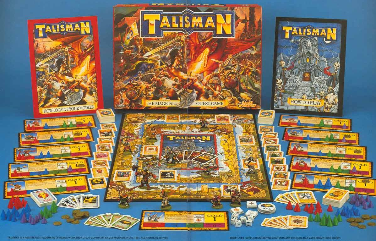 Toca un post de esos para viejunos y para curiosos. Veréis, tenemos que retroceder el reloj del tiempo al año 2000 (o 2001), en casa de mi amigo / adversario Ramón, con el que había estrenado Sexta Edición. Un día en su casa nos dice «¿Queréis jugar a un juego que está ambientado en el mundo de Warhammer pero es algo así como la oca con toques de rol?». Nos quedamos con cara de «¿eing?», pero aceptamos. Y aquél día pude jugar por primera vez a un juego clásico de Games Workshop que ha tenido varias ediciones, ha tenido videojuegos, e incluso una versión de 40k entre otras cosas. Hablo, por supuesto, de Talisman.