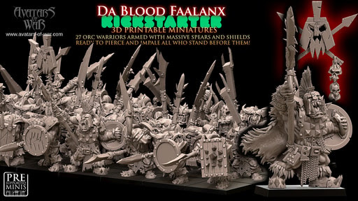 Post breve. Avatars of War sigue con su buena costumbre de sacar un crowdfunding con nuevas miniaturas cada mes. Este Octubre saca La Falange Zangrienta, un kickstarter para tener un montón de guerreros orcos con lanza y escudo. A falta de 9 días, ya han conseguido más de 1.400€ (de los 100€ necesarios), y es que por tan sólo 9€ te llevas los STL para imprimir 27 miniaturas distintas (24 lanceros y 3 del grupo de mando). El campeón, con la cresta y la lanza es realmente impresionante (como podéis ver en la imagen).
